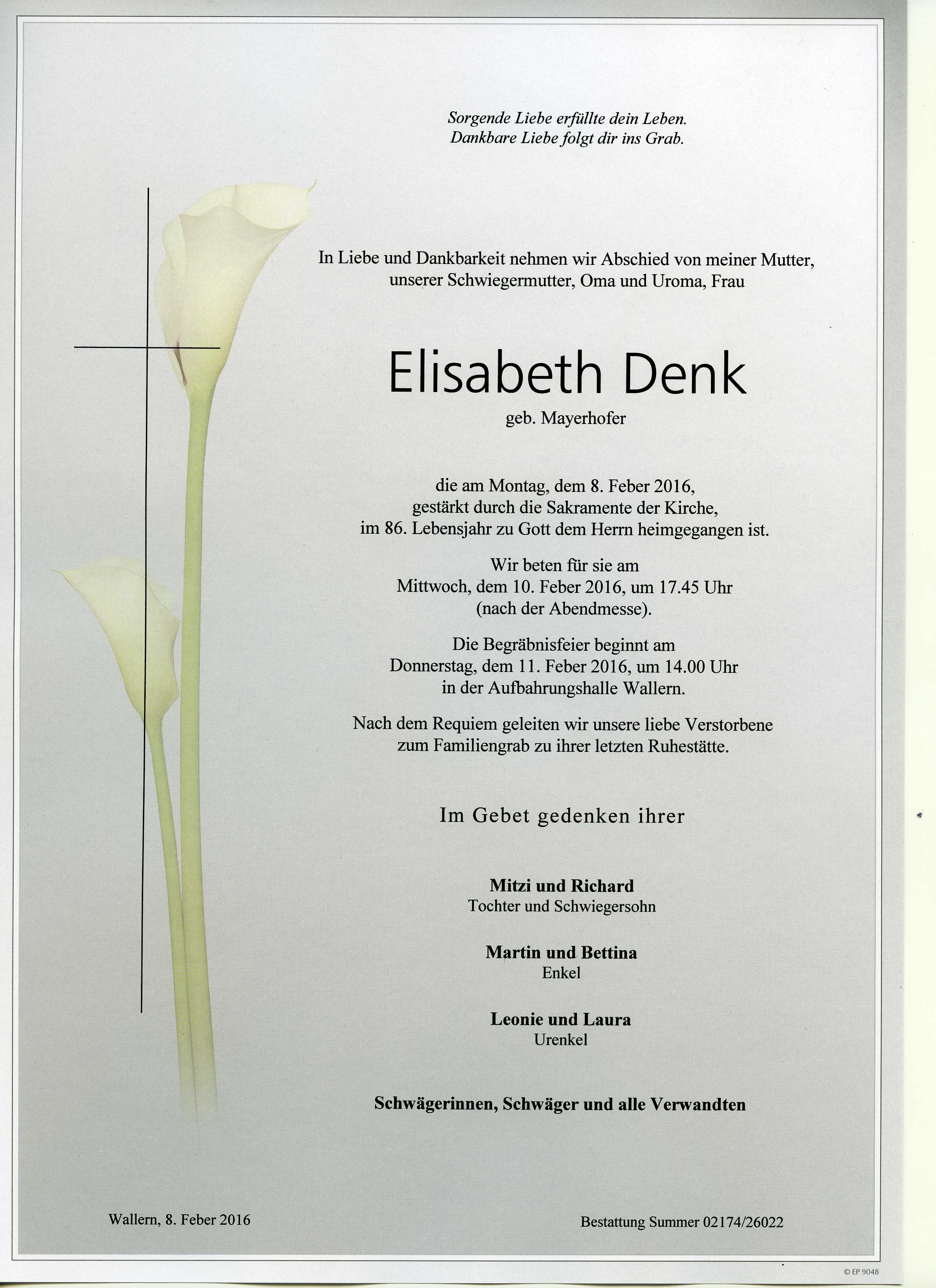 Denk Elisabeth aus 7151 Wallern, gestorben am 8. Feber 2016