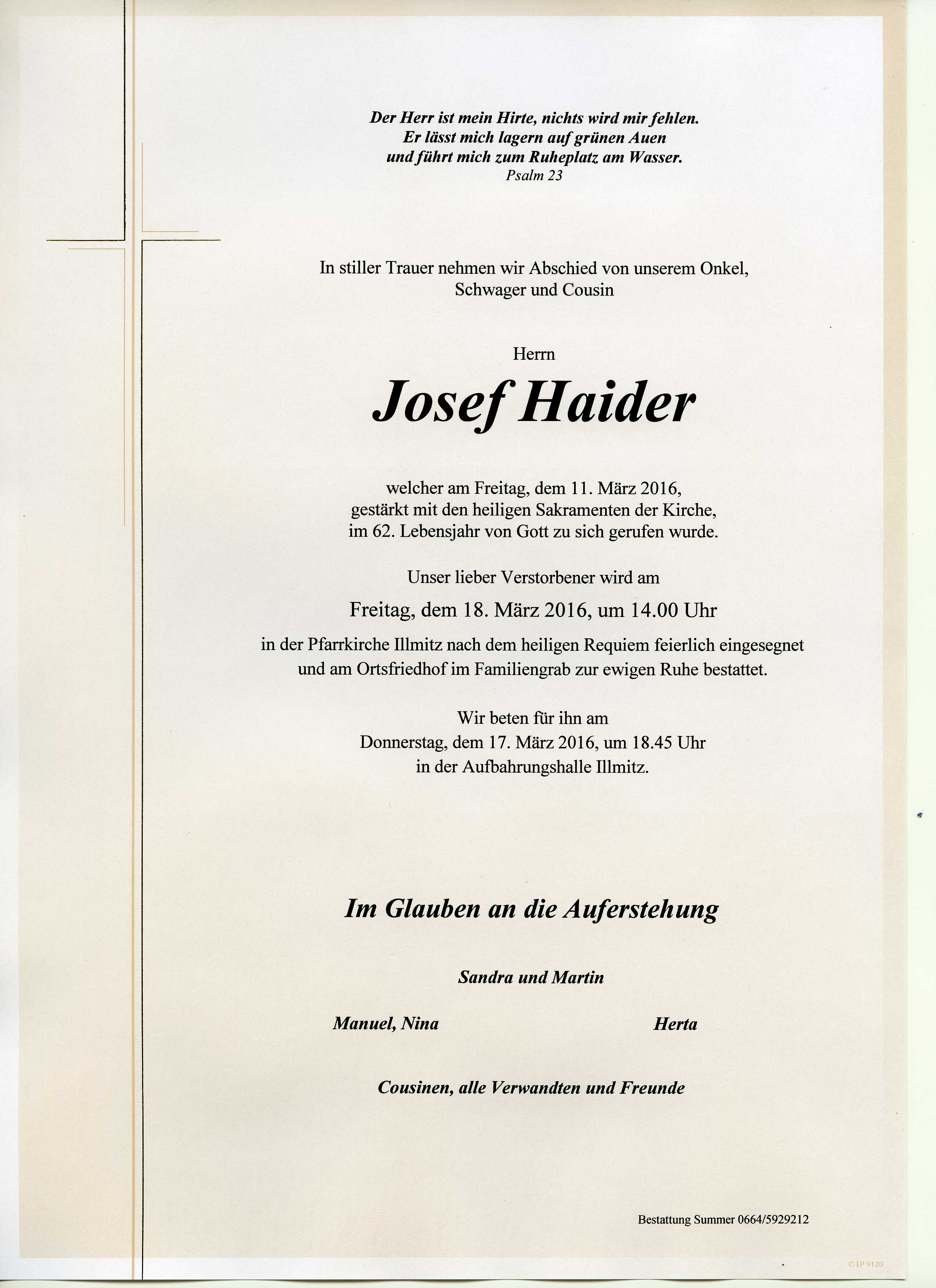 Haider Josef aus 7142 Illmitz, gestorben am 11. März 2016
