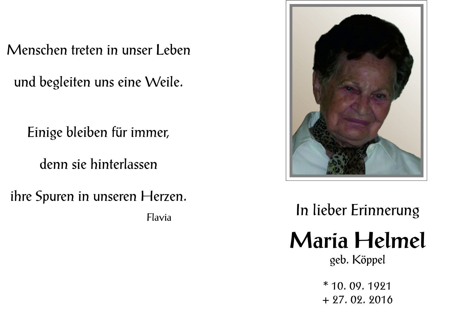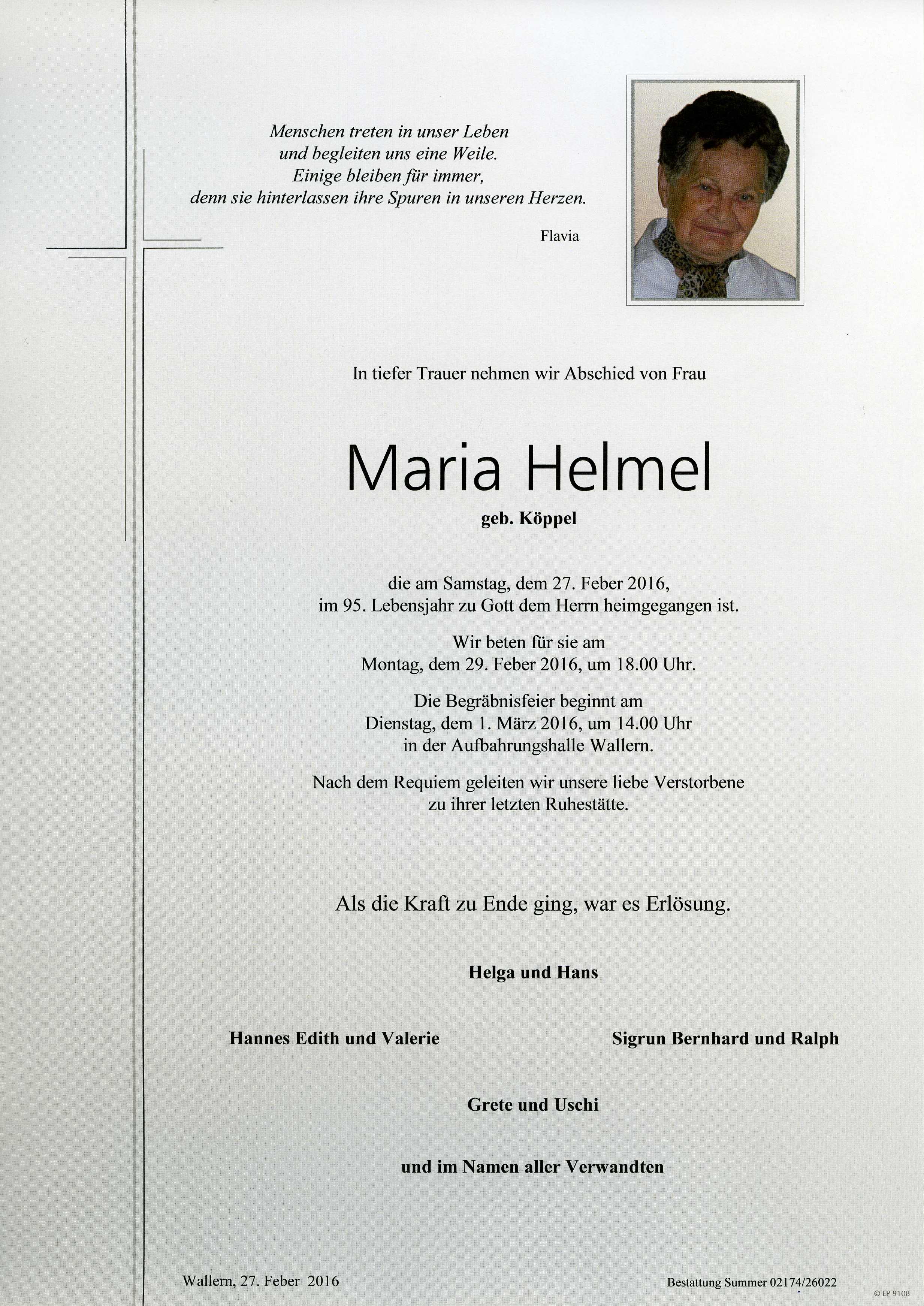 Helmel Maria aus 7151 Wallern, gestorben am 27. Feber 2016