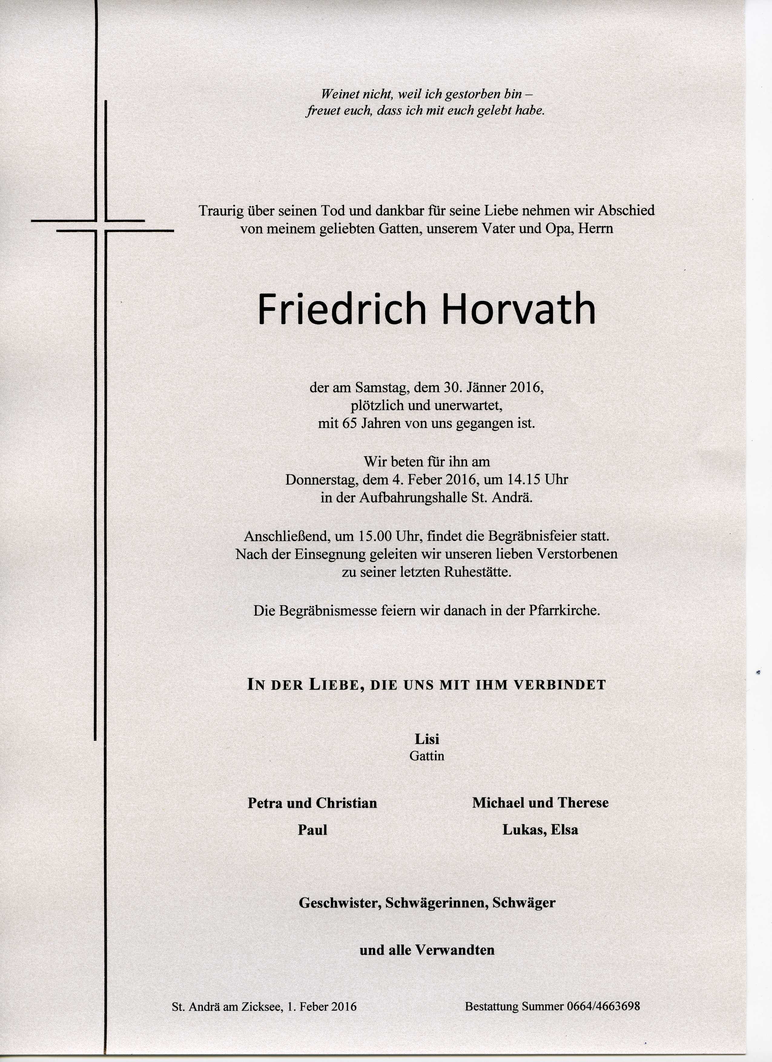 Horvath Friedrich aus 7161 St. Andrä am Zicksee, gestorben am 30. Jänner 2016