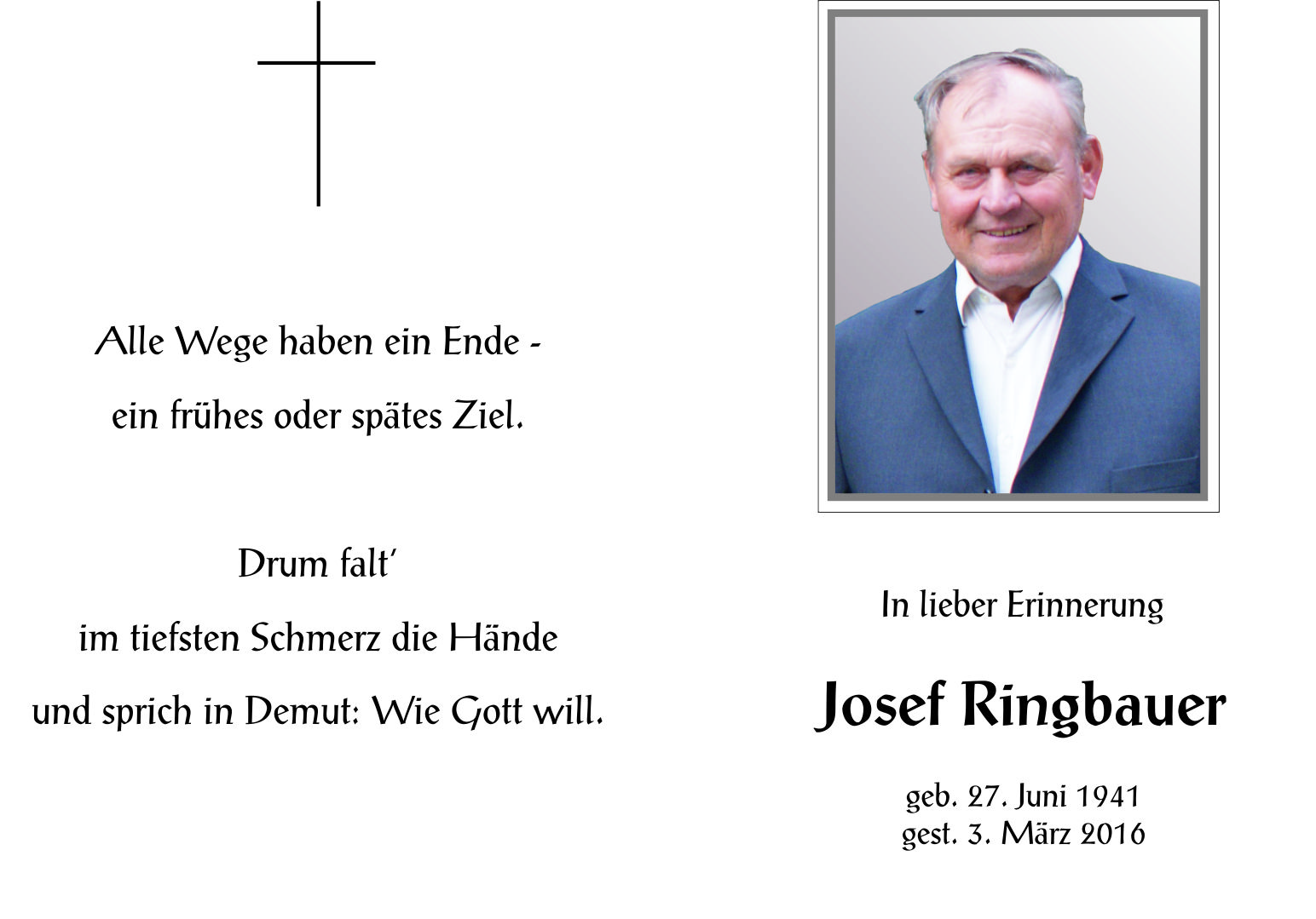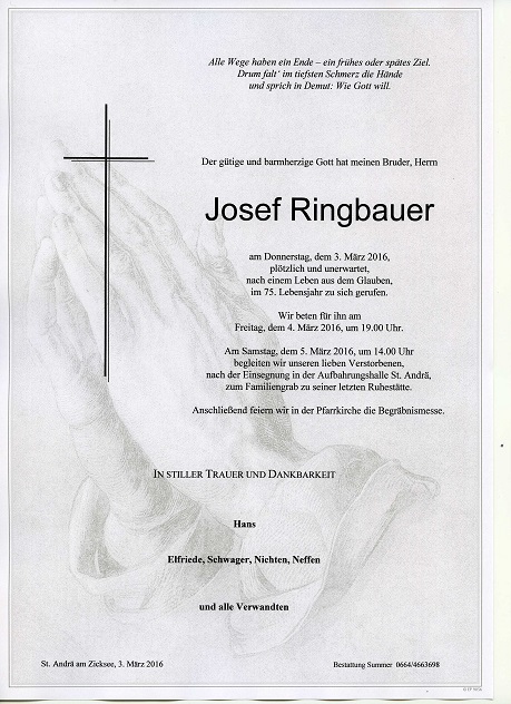 Ringbauer Josef aus 7161 St. Andrä am Zicksee, gestorben am 3. März 2016