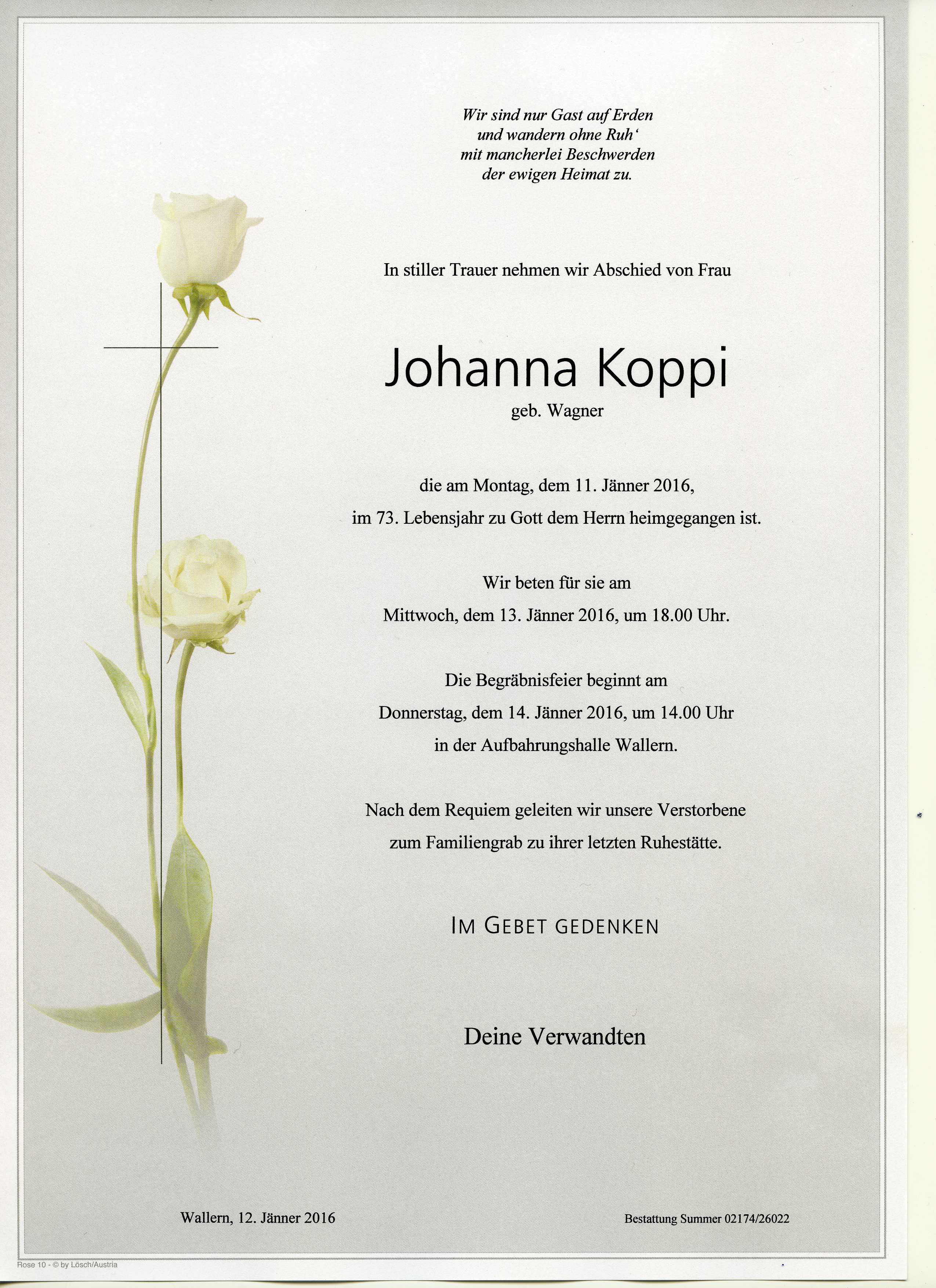 Koppi Johanna aus 7151 Wallern, gestorben am 11. Jänner 2016