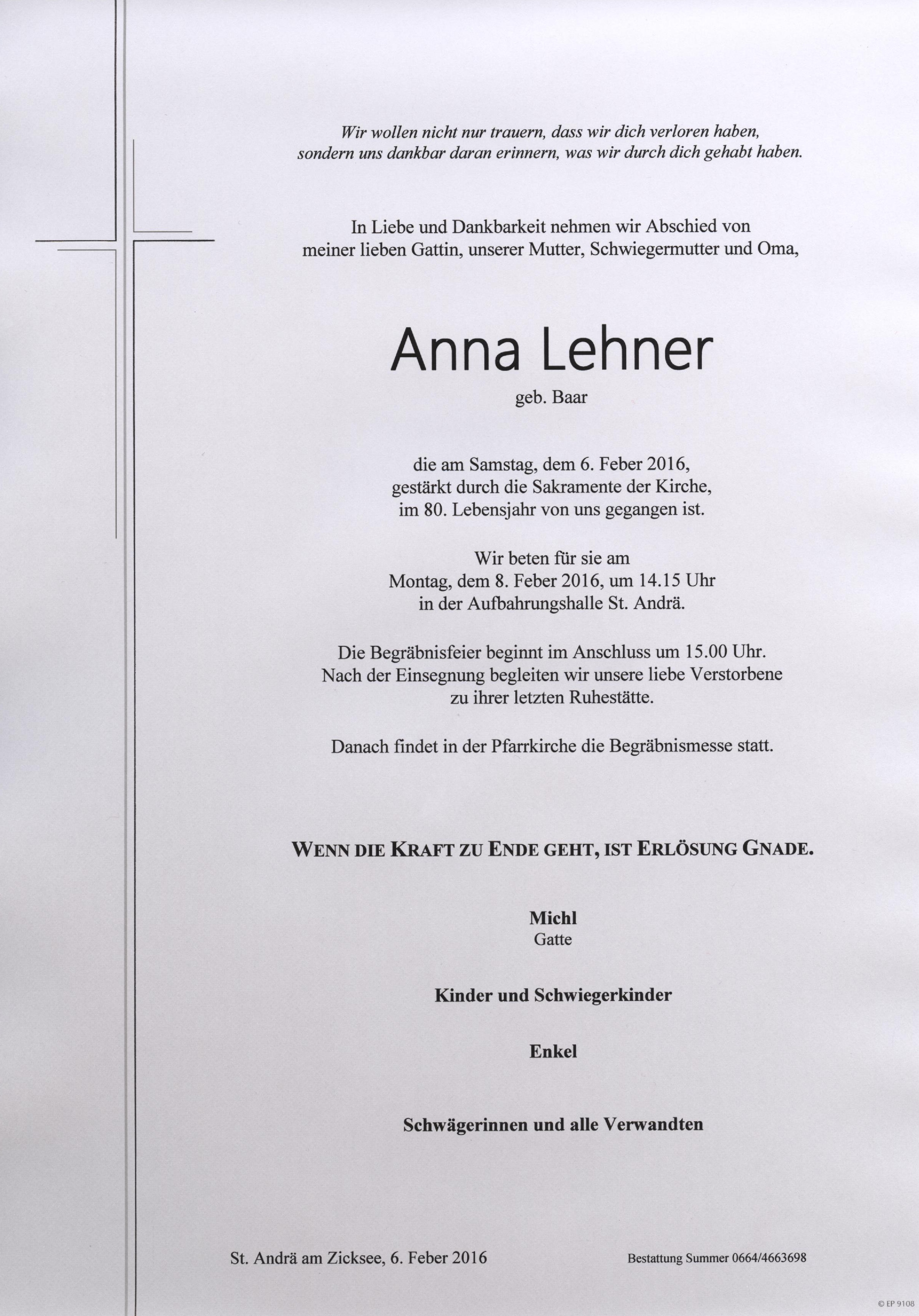 Lehner Anna aus 7161 St. Andrä am Zicksee, gestorben am 6- Feber 2016
