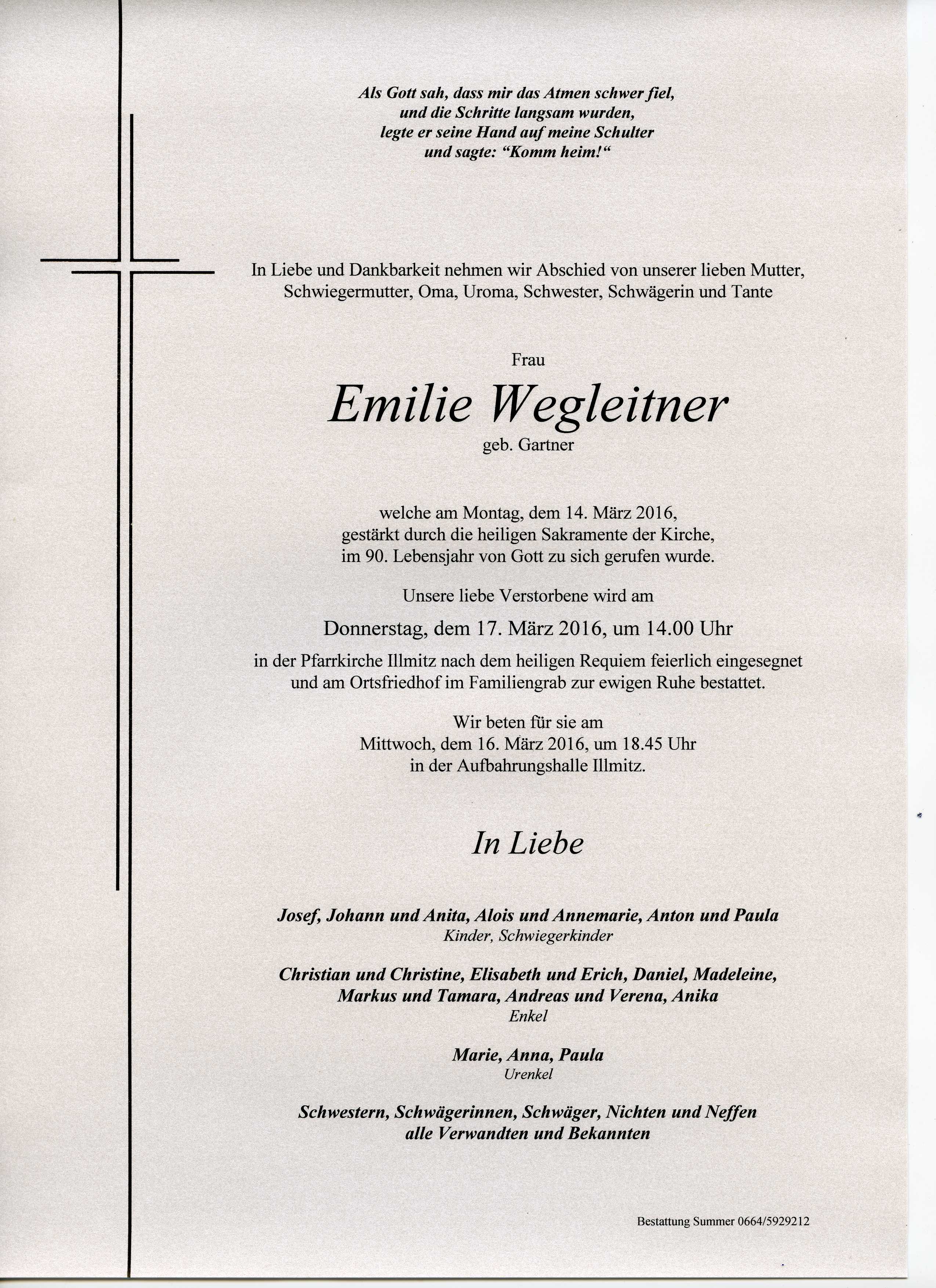 Wegleitner Emilie aus 7142 Illmitz, gestorben am 14. März 2016