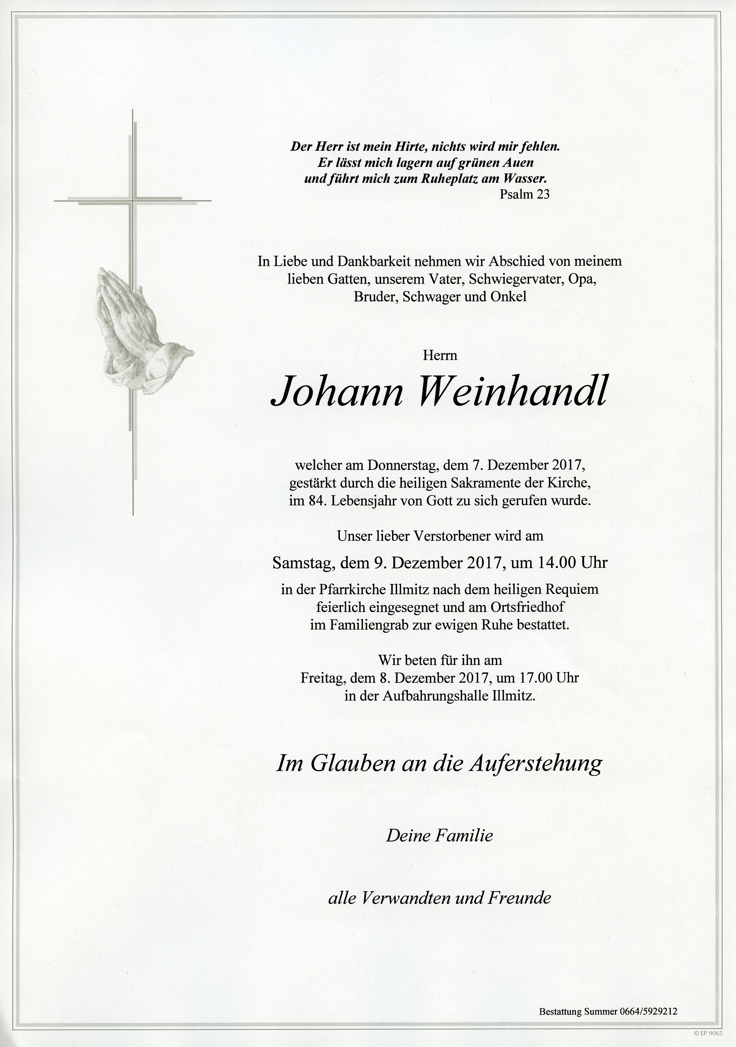 Weinhandl Johann aus 7142 Illmitz, gestorben am 19. Feber 2016