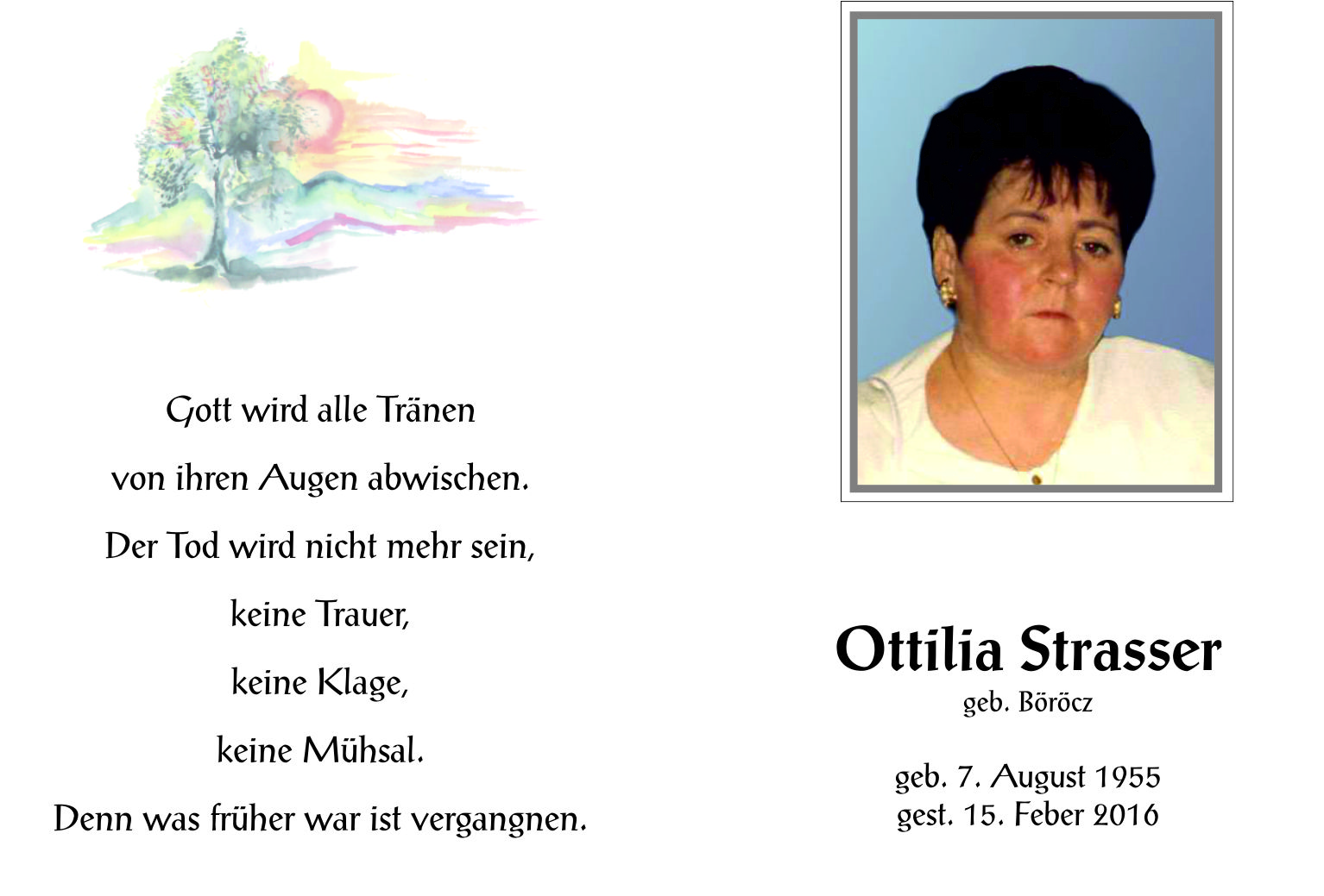 Strasser Ottilia aus 7151 Wallern, gestorben am 15. Feber 2016
