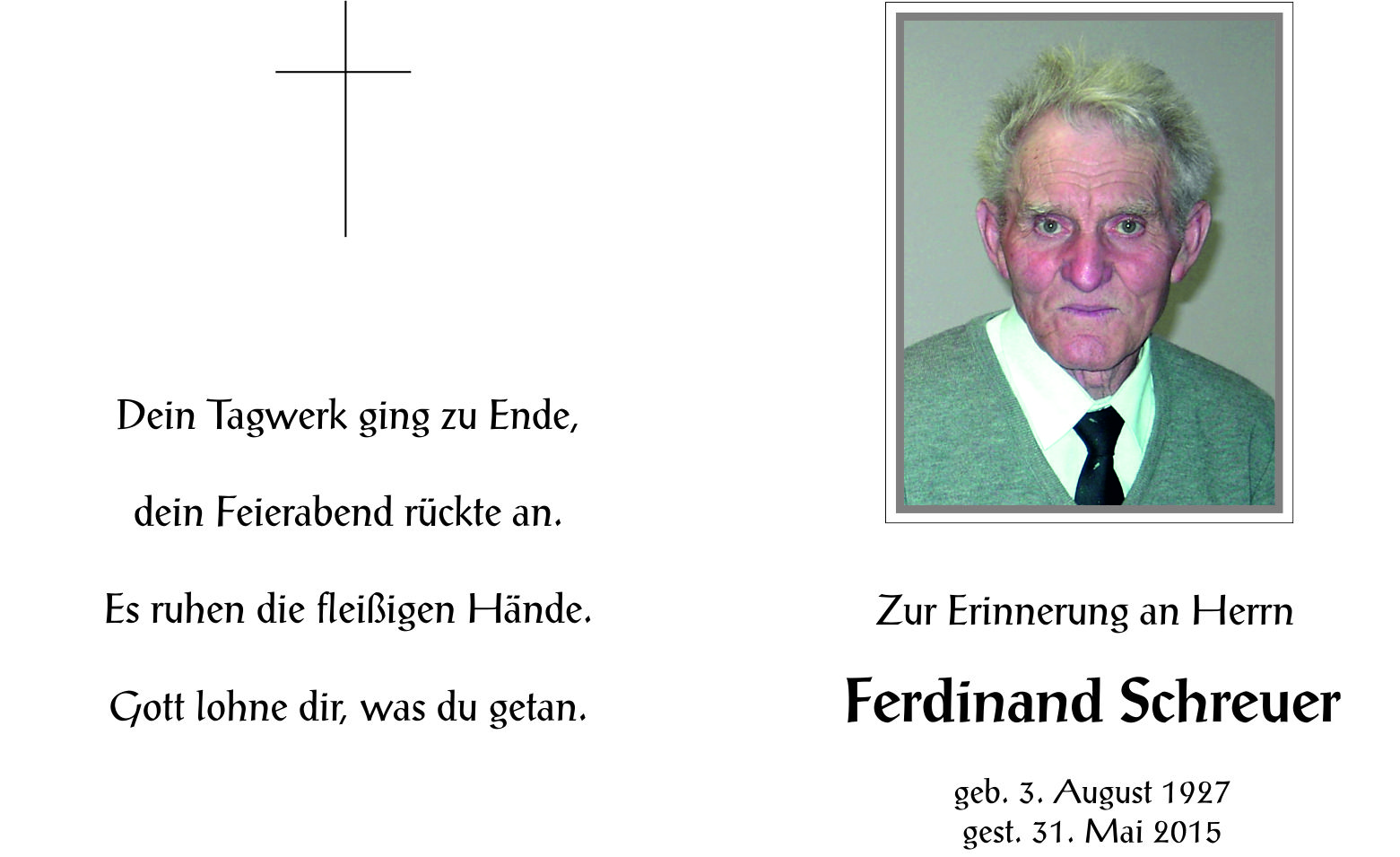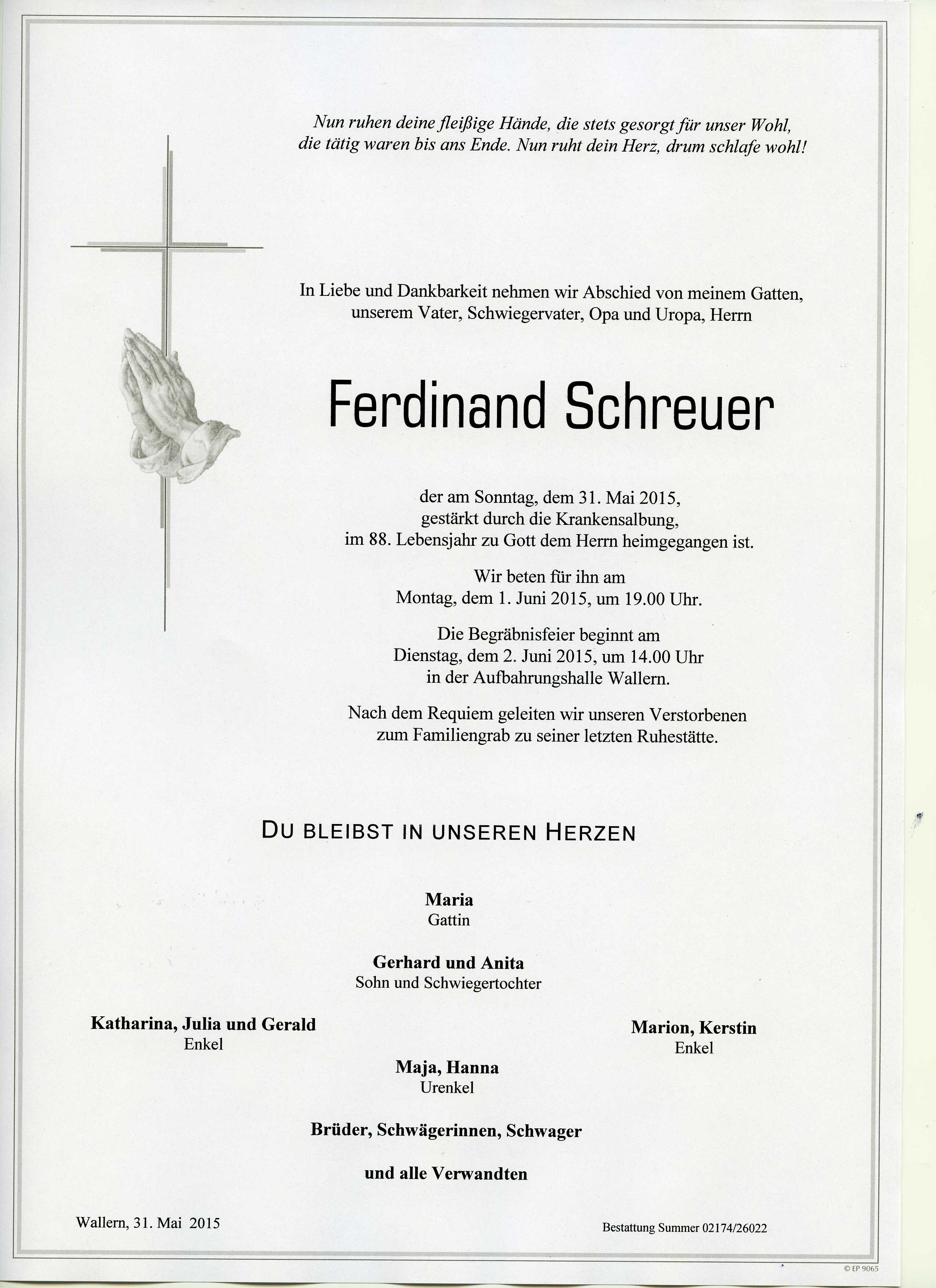 Schreuer Ferdinand aus 7151 Wallern, gestorben am 31.05.2015