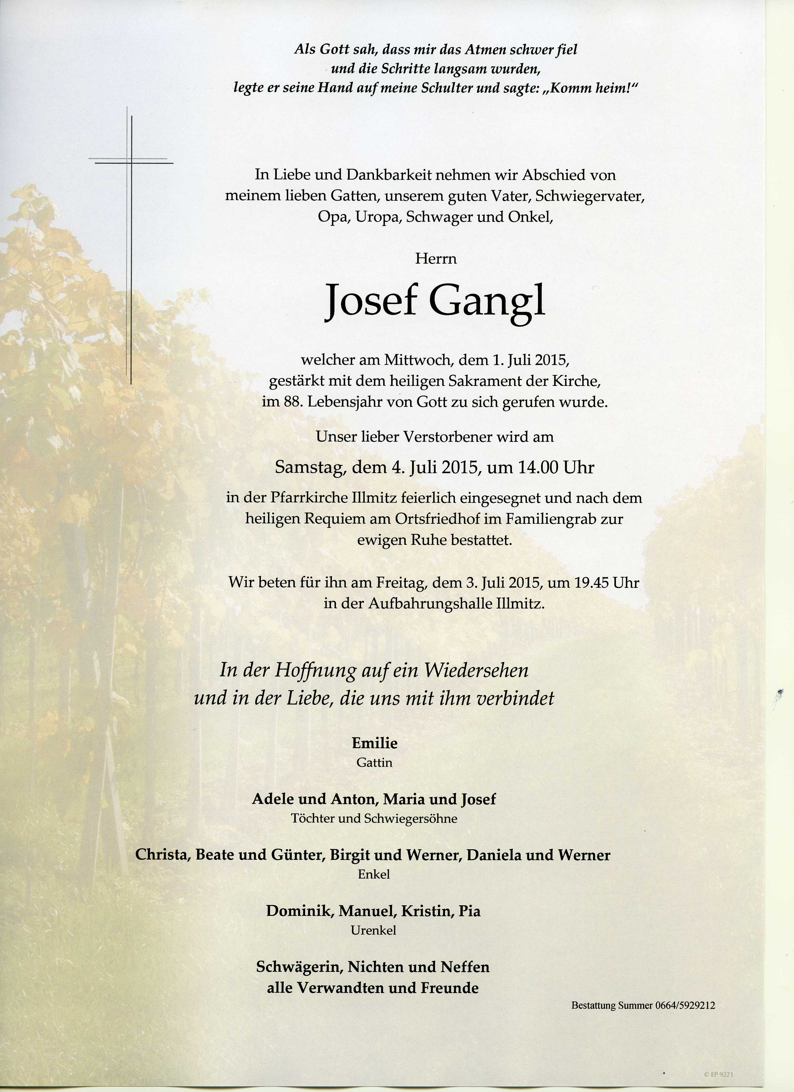 Gangl Josef aus 7142 Illmitz, gestorben am 1. juli 2015