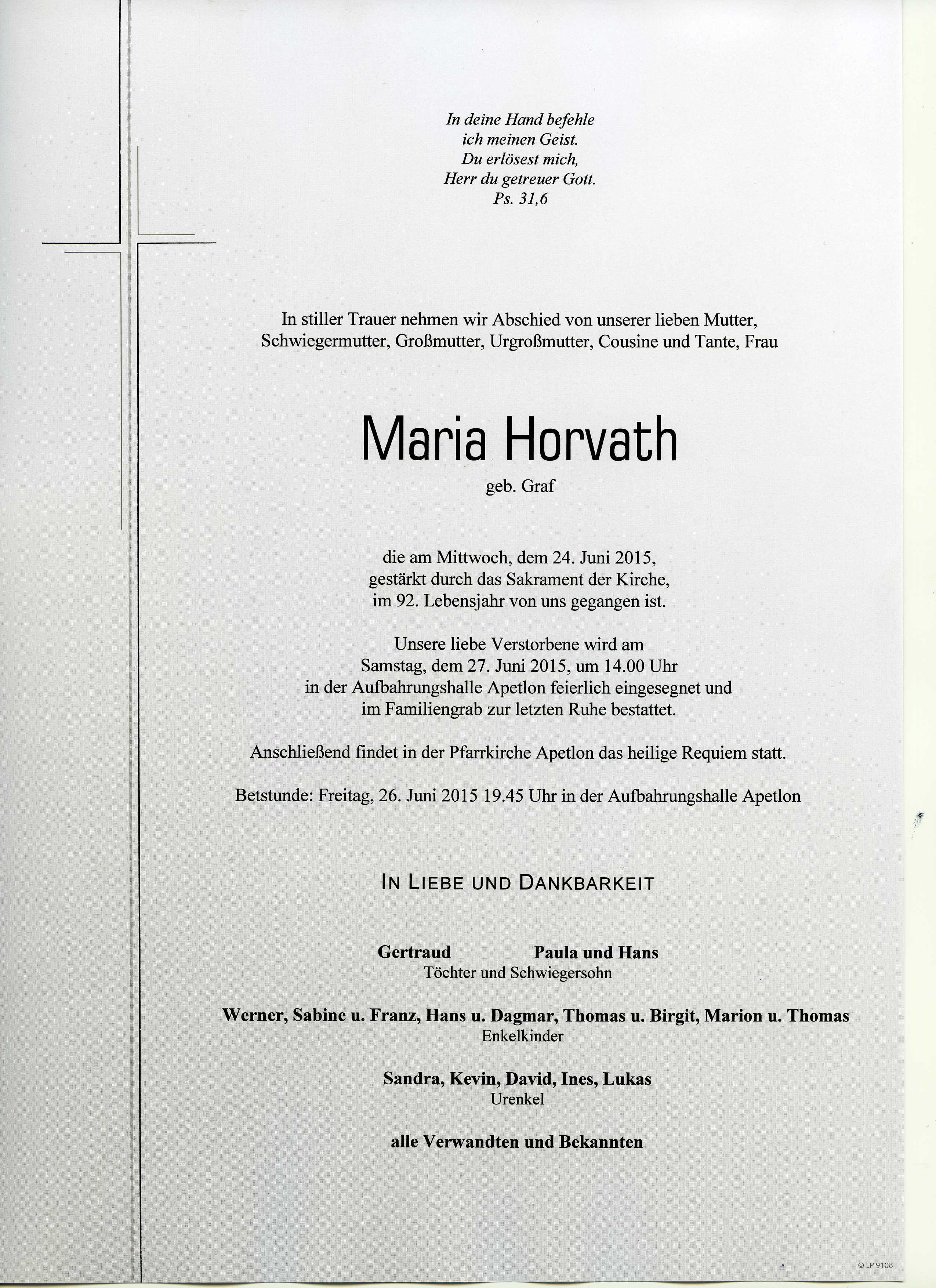 Horvath Maria aus 7143 Apetlon, gestorben am 24. Juni 2015