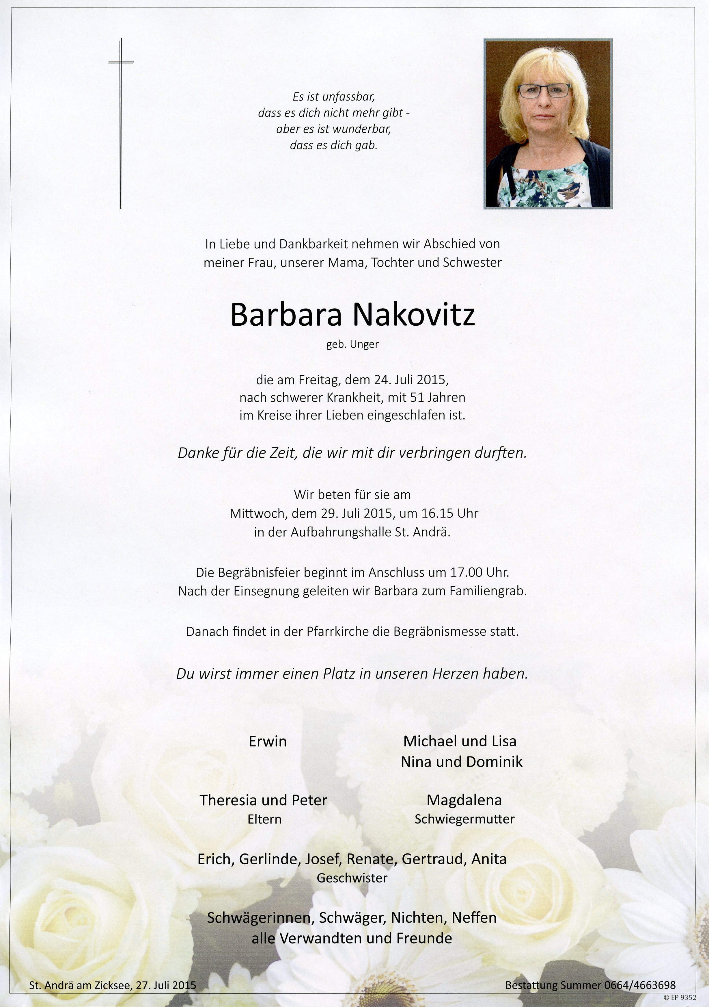 Nakovitz Barbara aus 7161 St. Andrä am Zicksee, gestorben am 24.07.2015