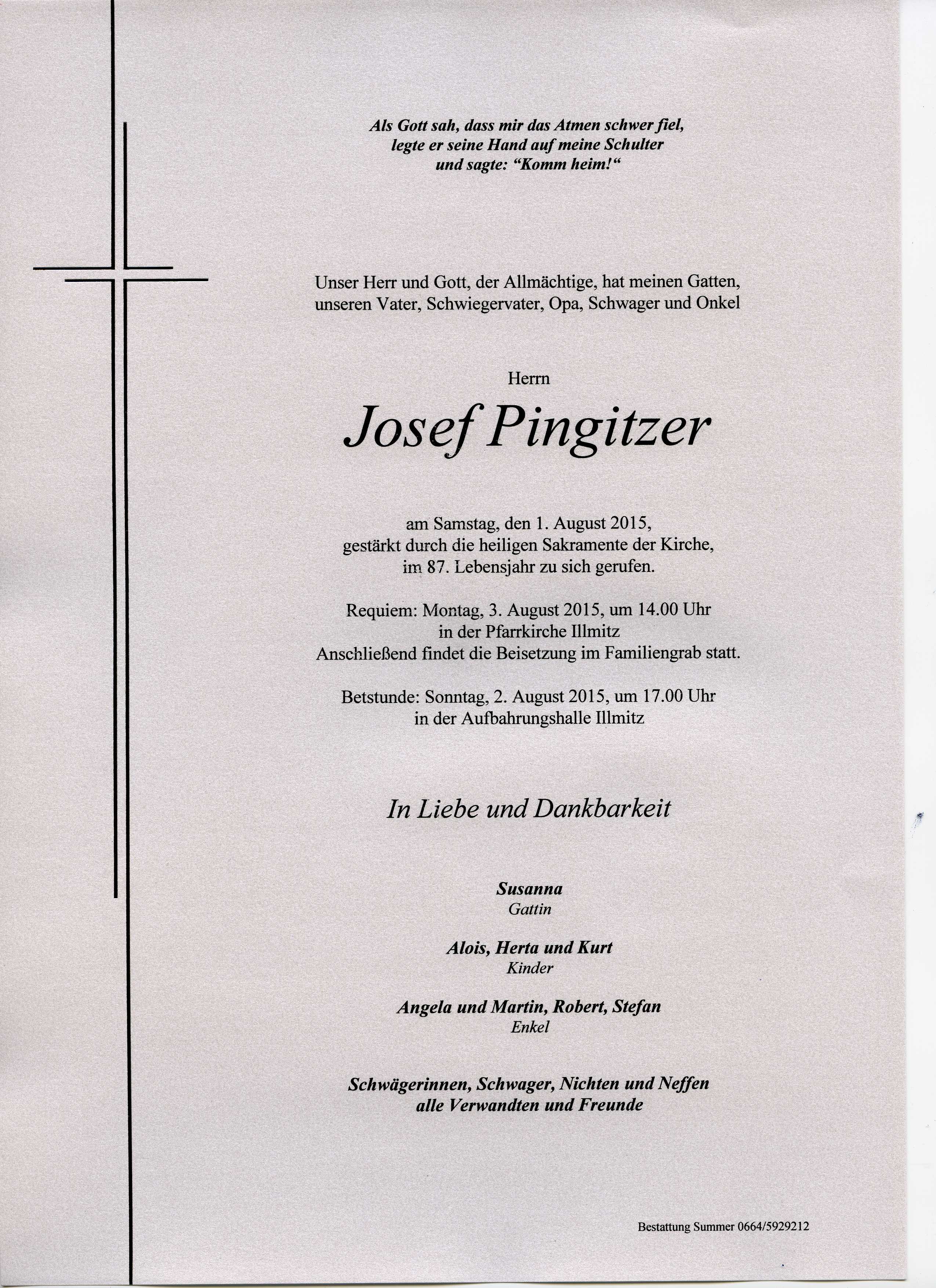 Pingitzer Josef aus 7142 Illmitz, gestorben am 01.08.2015