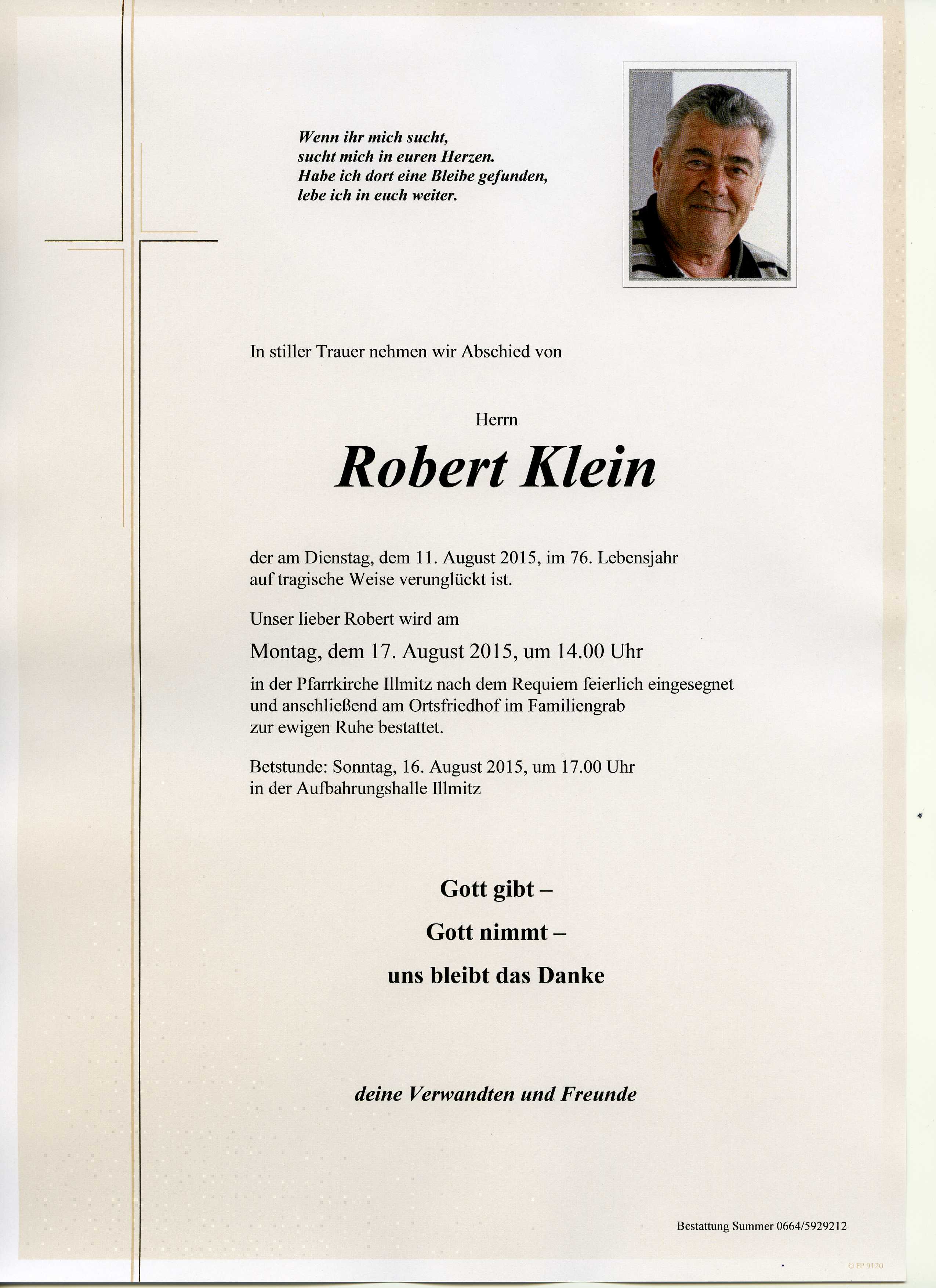 Klein Robert aus 7142 Illmitz, gestorben am 11. August 2015