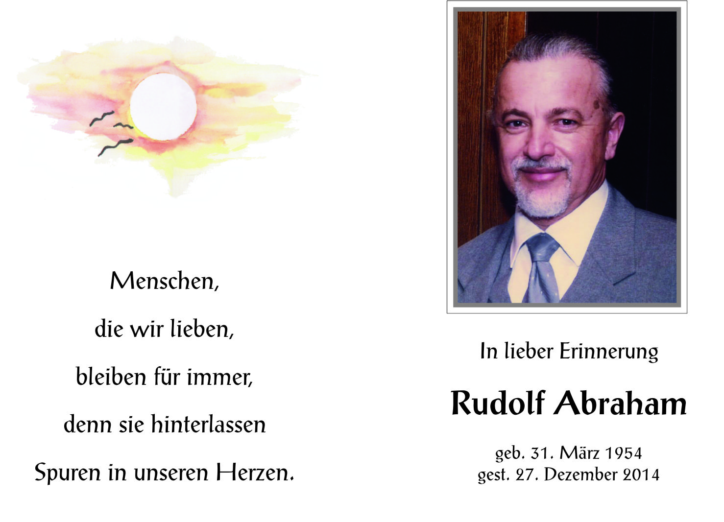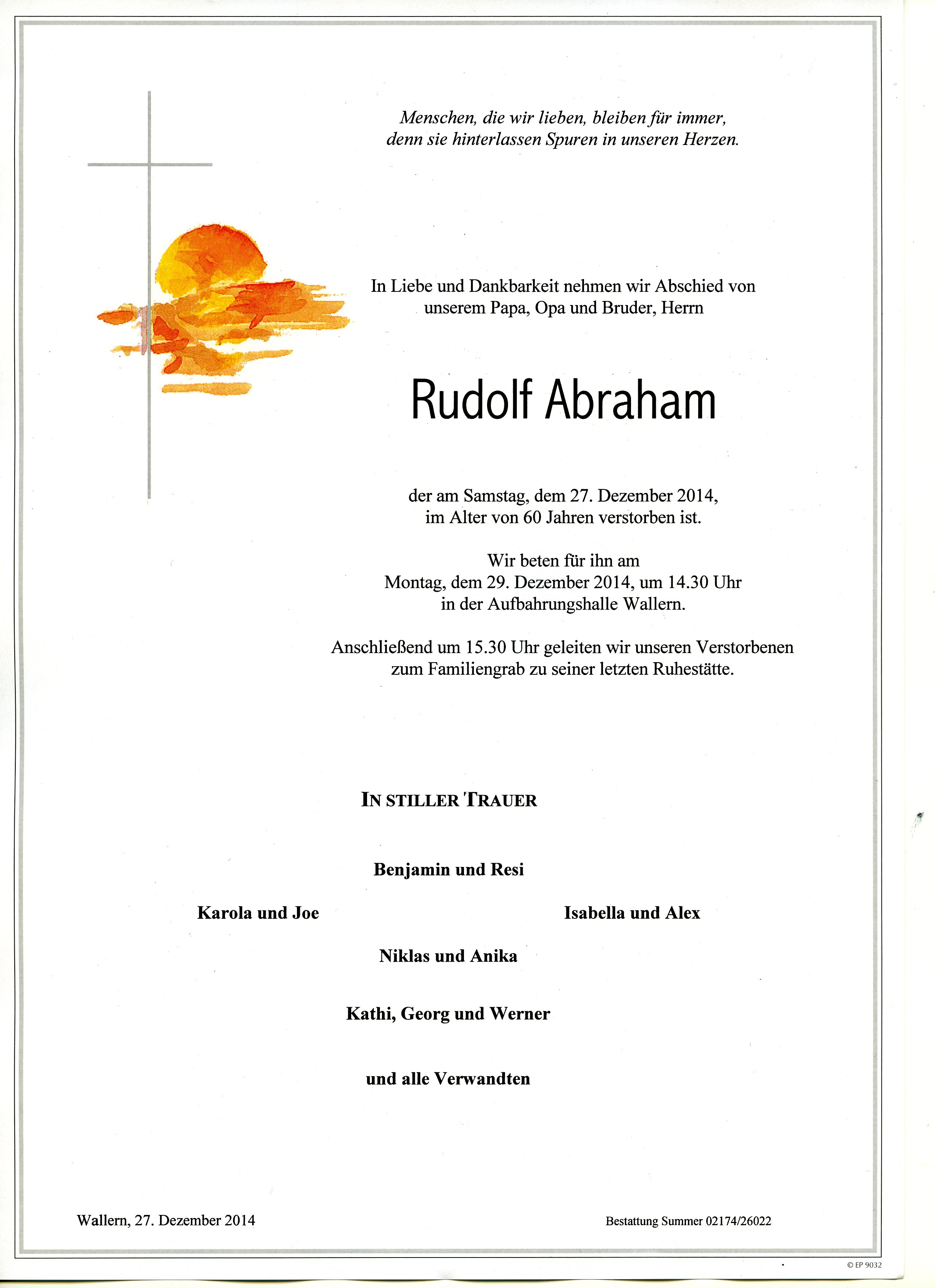 Abraham Rudolf aus 7151 Wallern, gestorben am 27. Dezember 2014