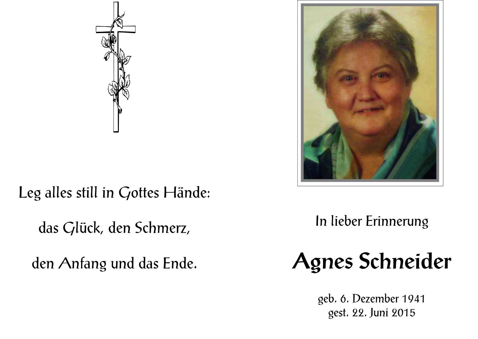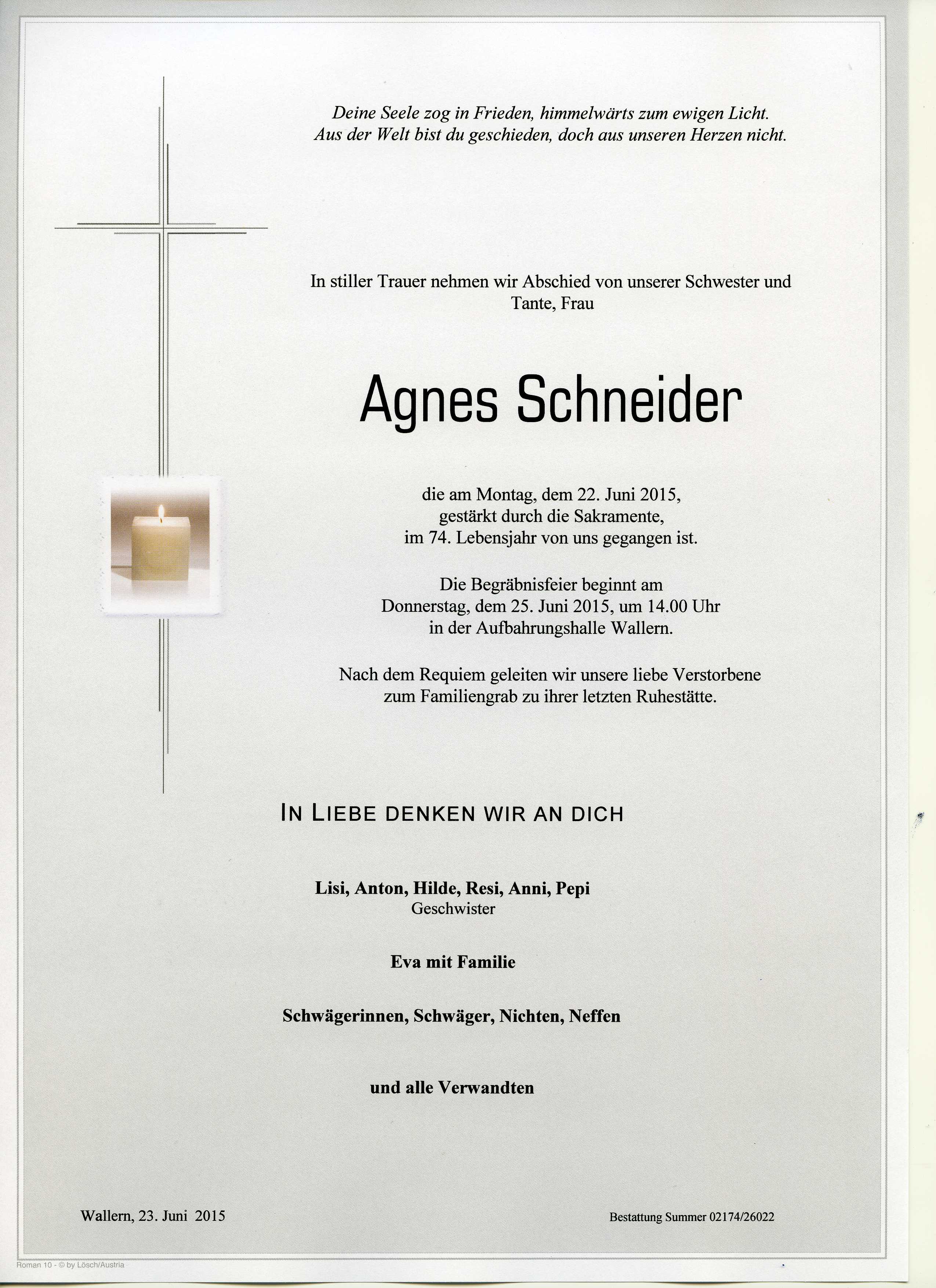 Schneider Agnes aus 7151 Wallern, gestorben am 22. Juni 2015