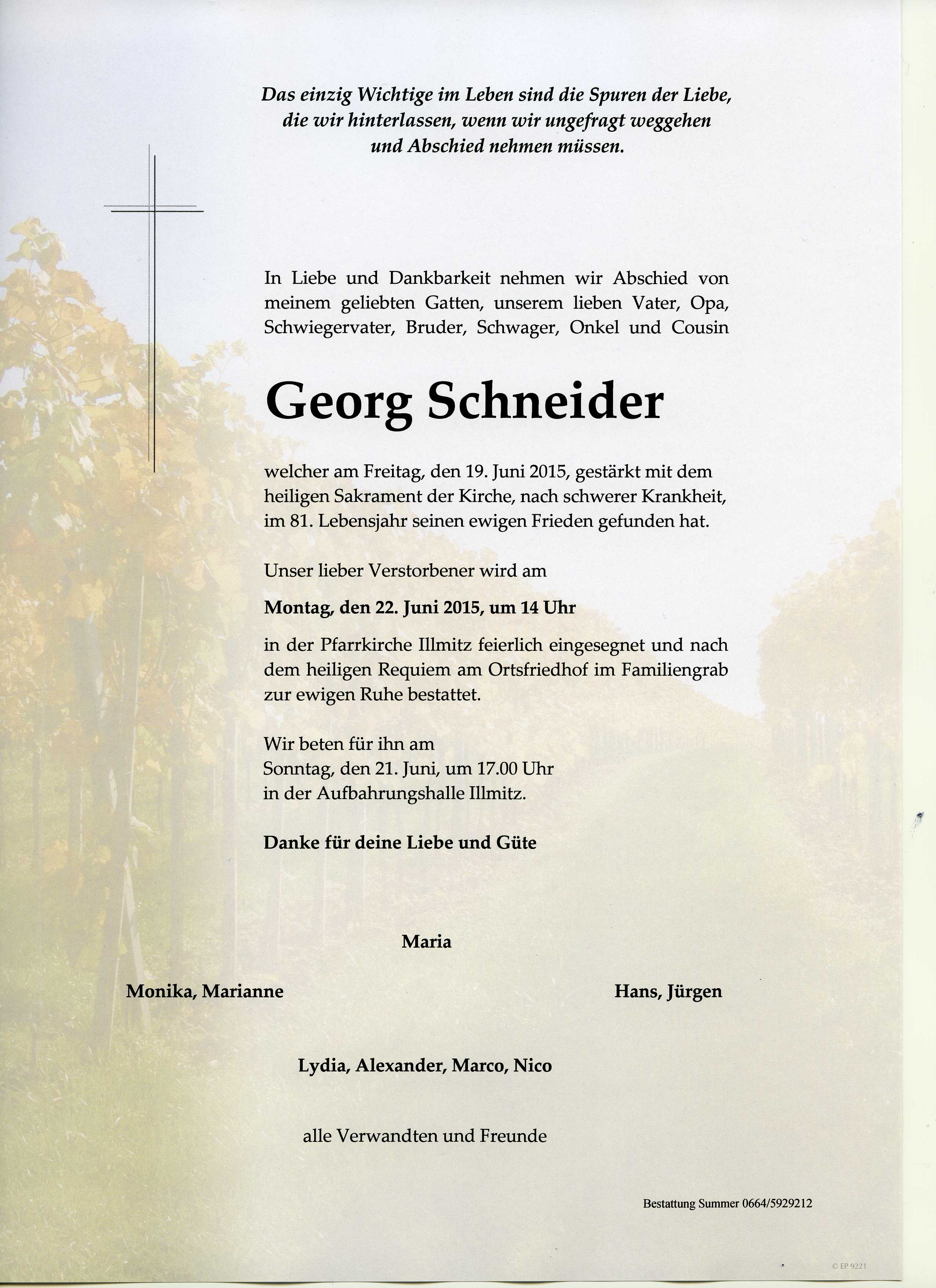 Schneider Georg aus 7142 Ollmitz, gestorben am 19. Juni 2015