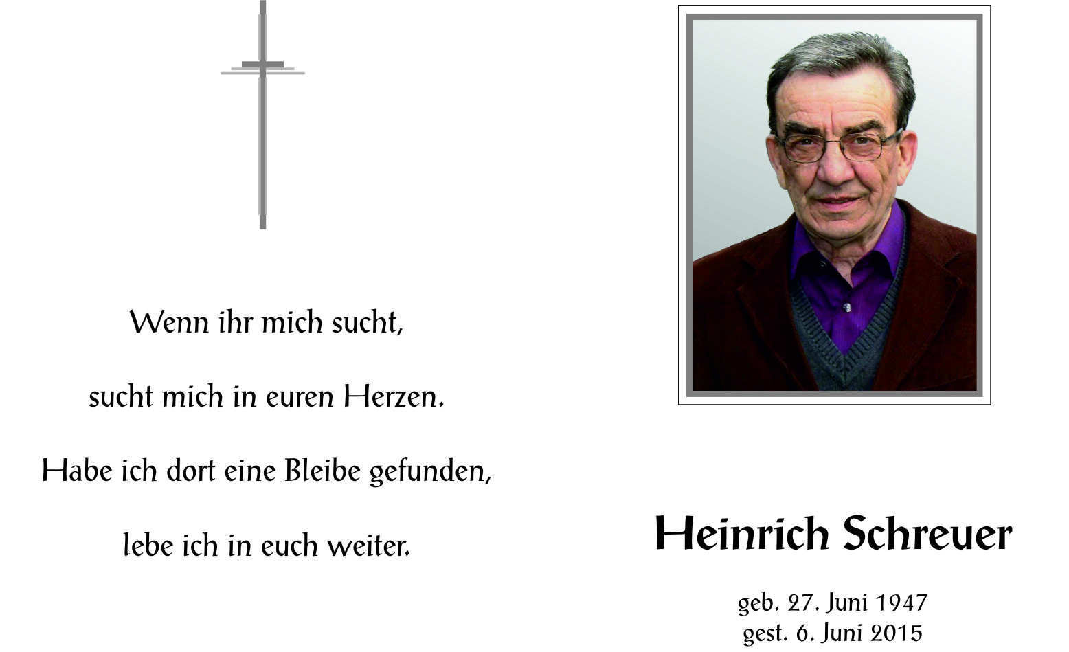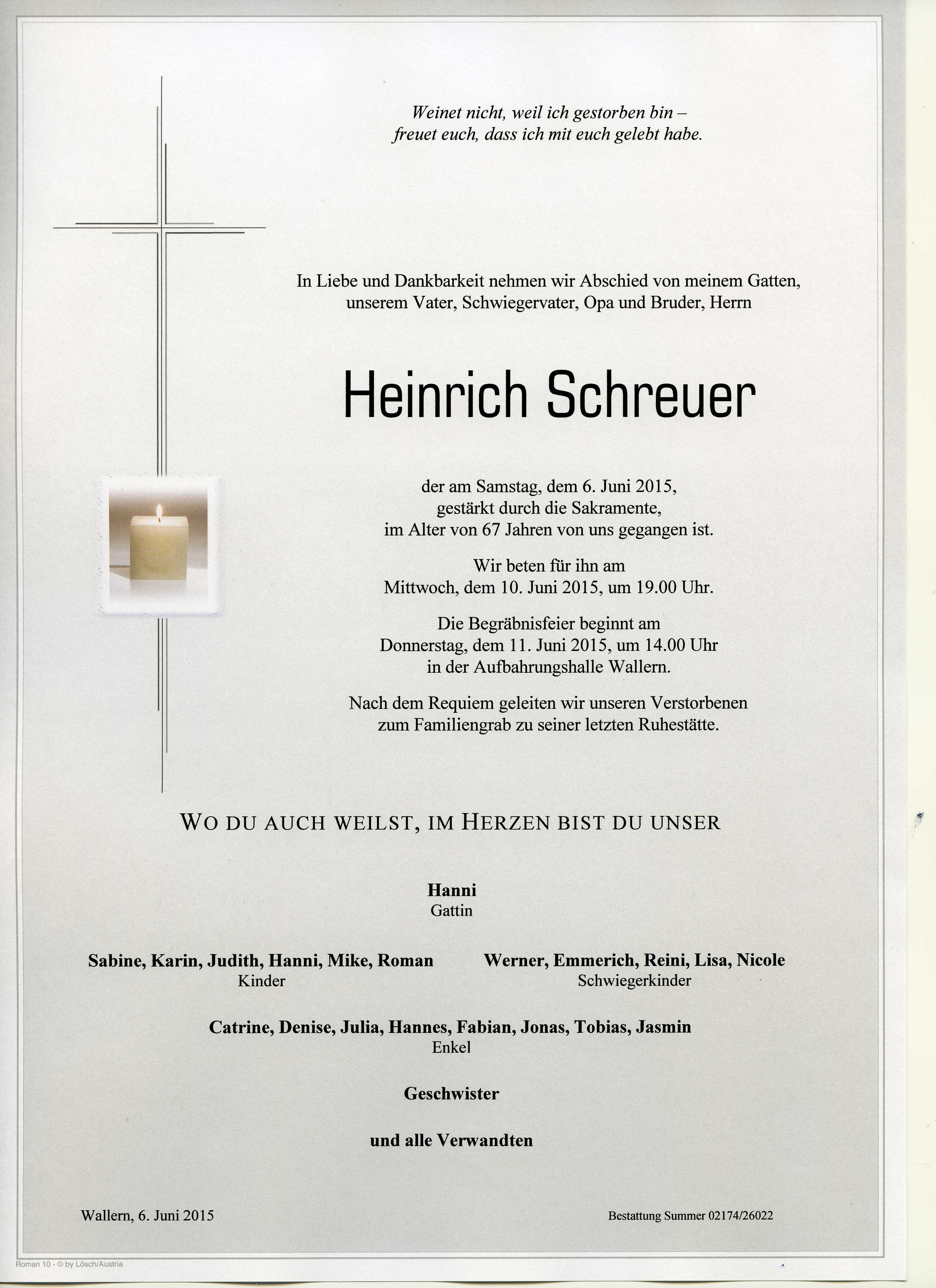Schreuer Heinrich aus 7151 Wallern, gestorben am 06.06.2015