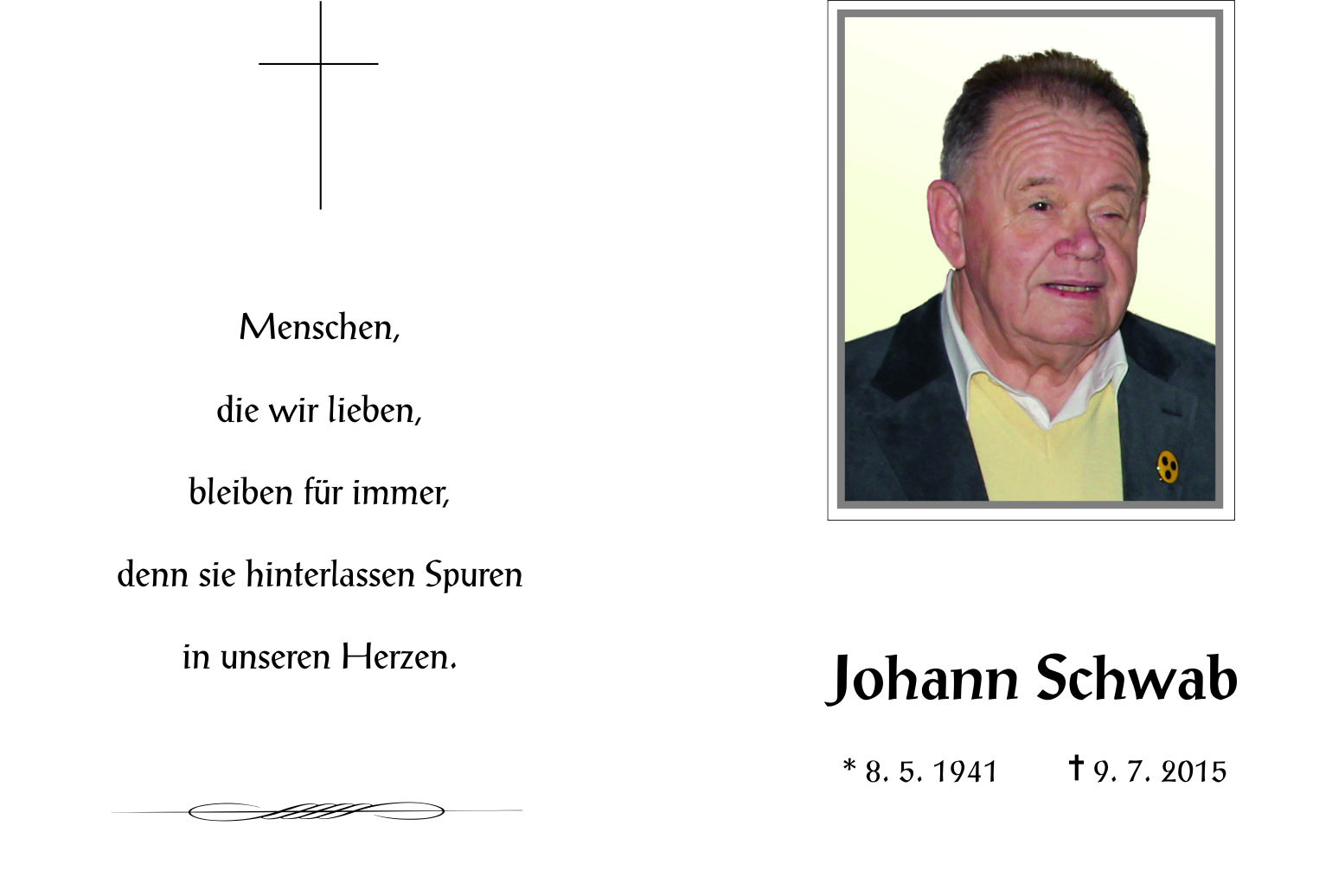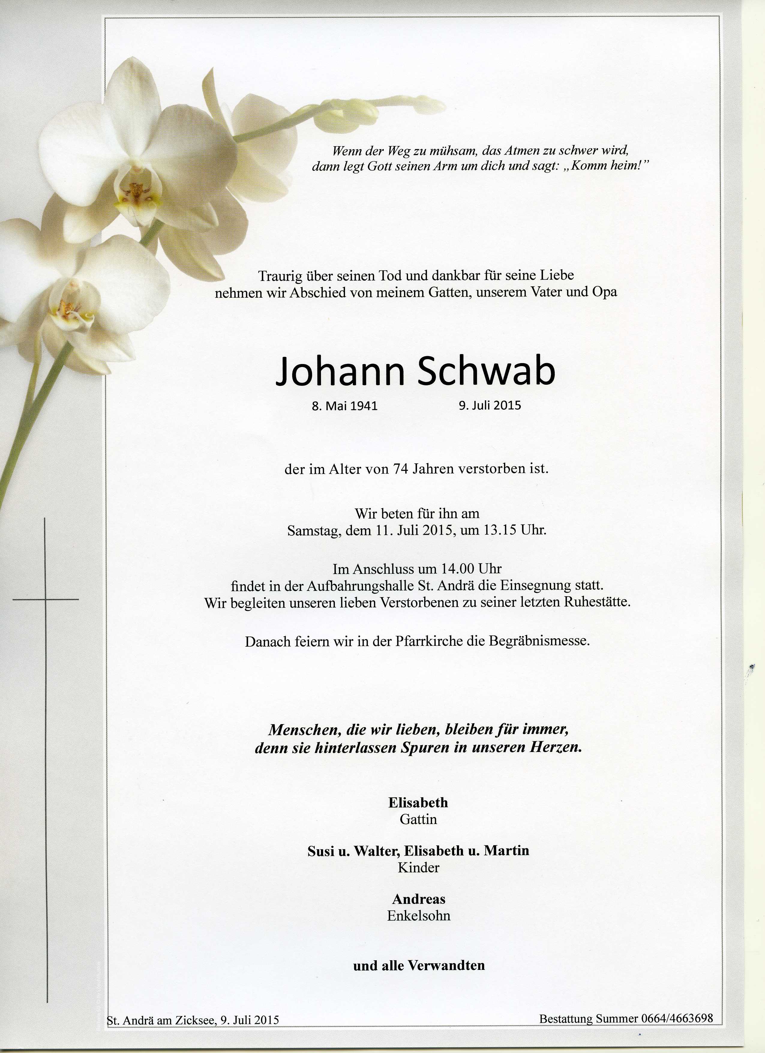 Schwab Johann aus 7161 St. Andrä am Zicksee, gestorben am 9. Juli 2015