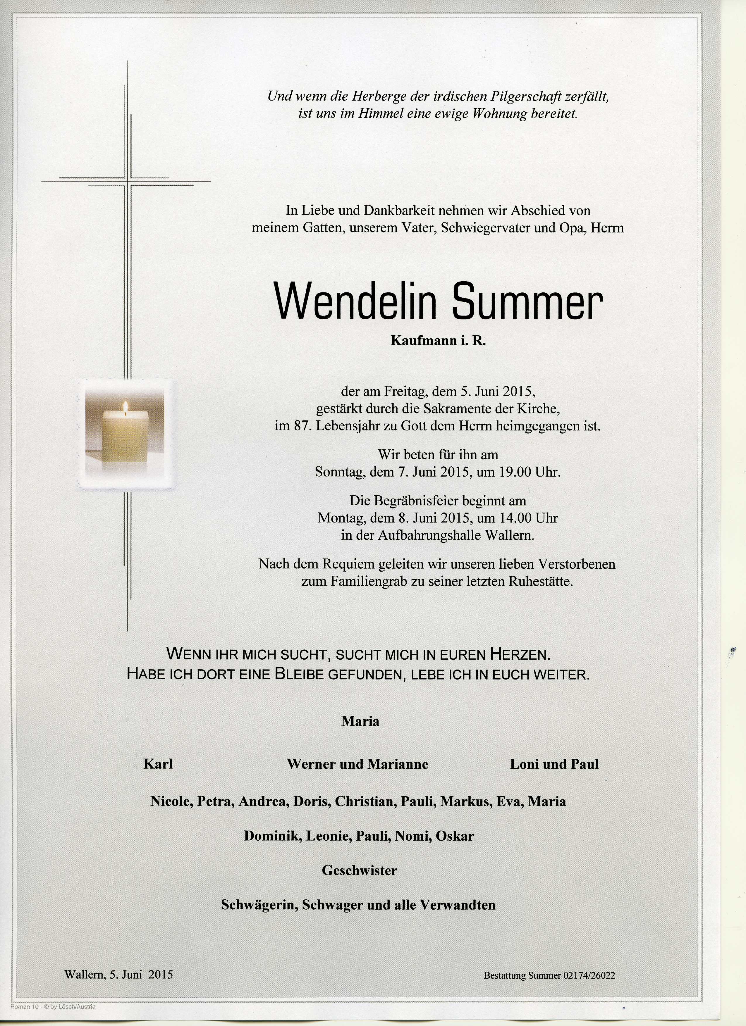 Summer Wendelin aus 7151 Wallern, gestorben am 05.06.2015