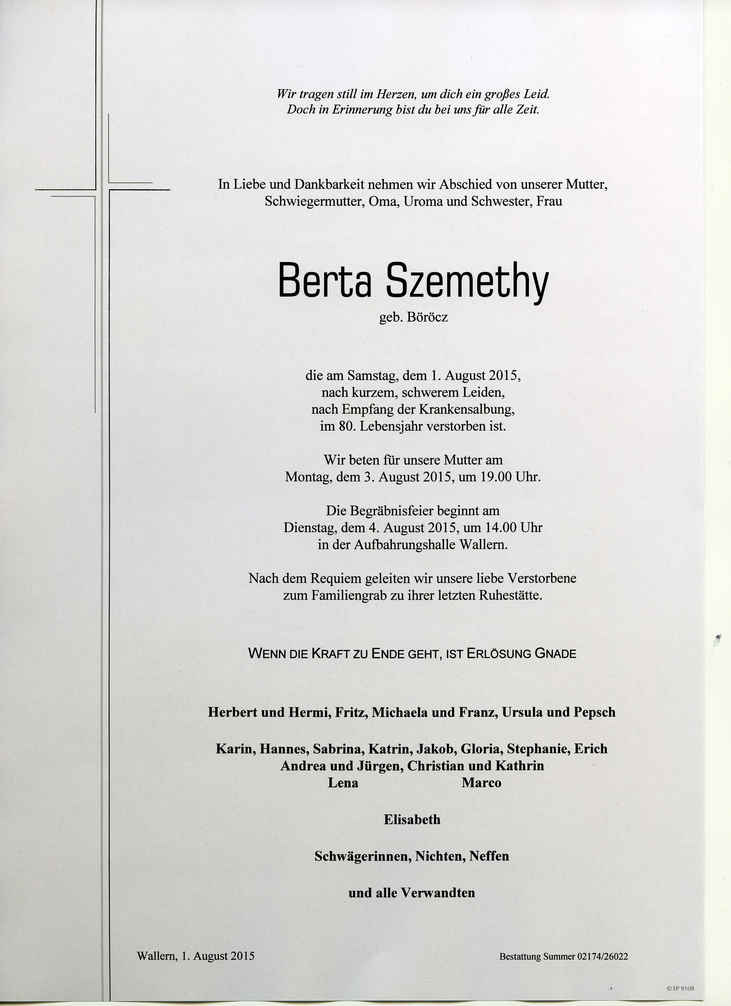 Szemethy Berta aus 7151 Wallern, gestorben am 01.08.2015