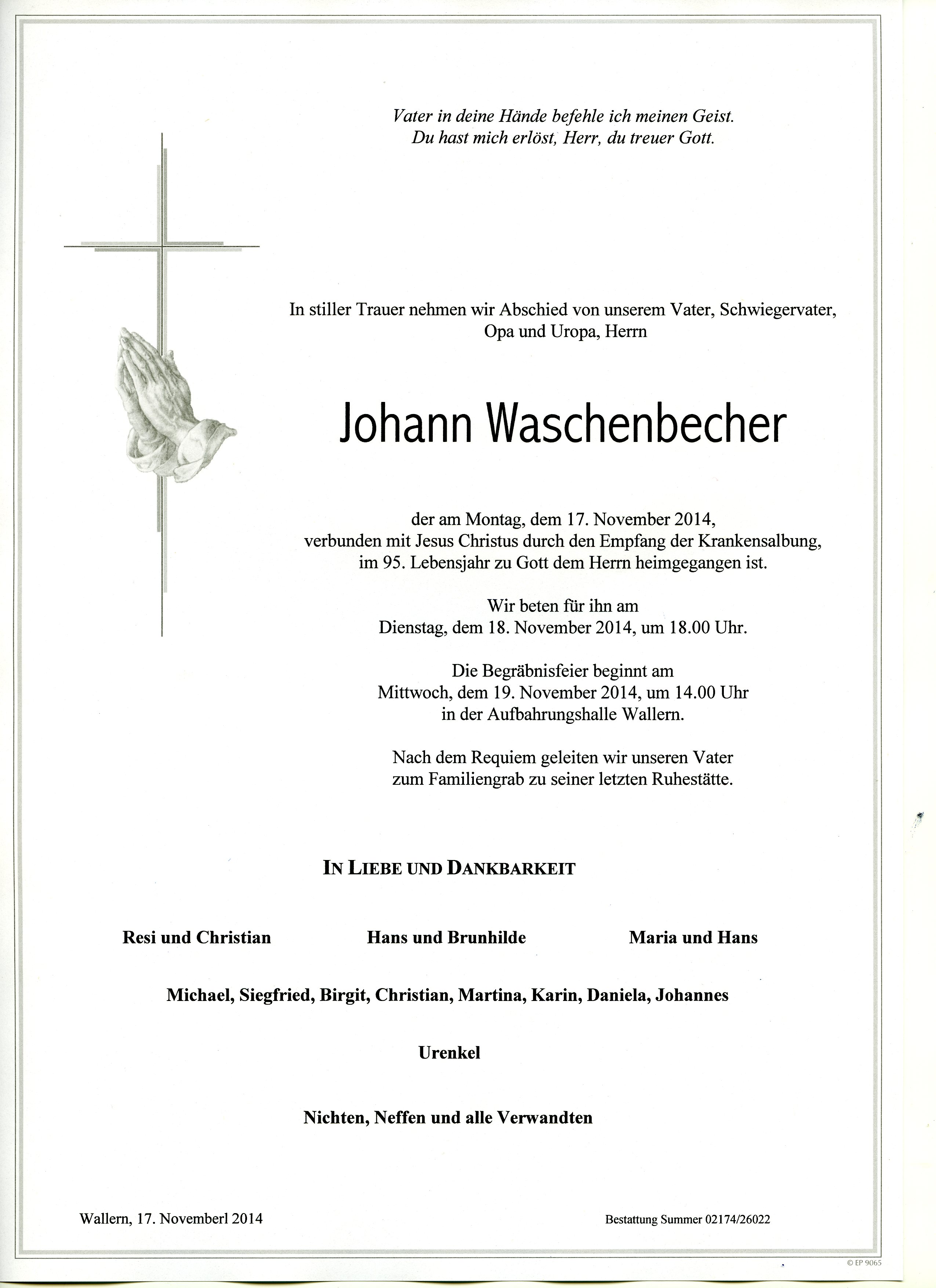Waschenbecher Johann aus 7151 Wallern, gestorben am 17. November 2014