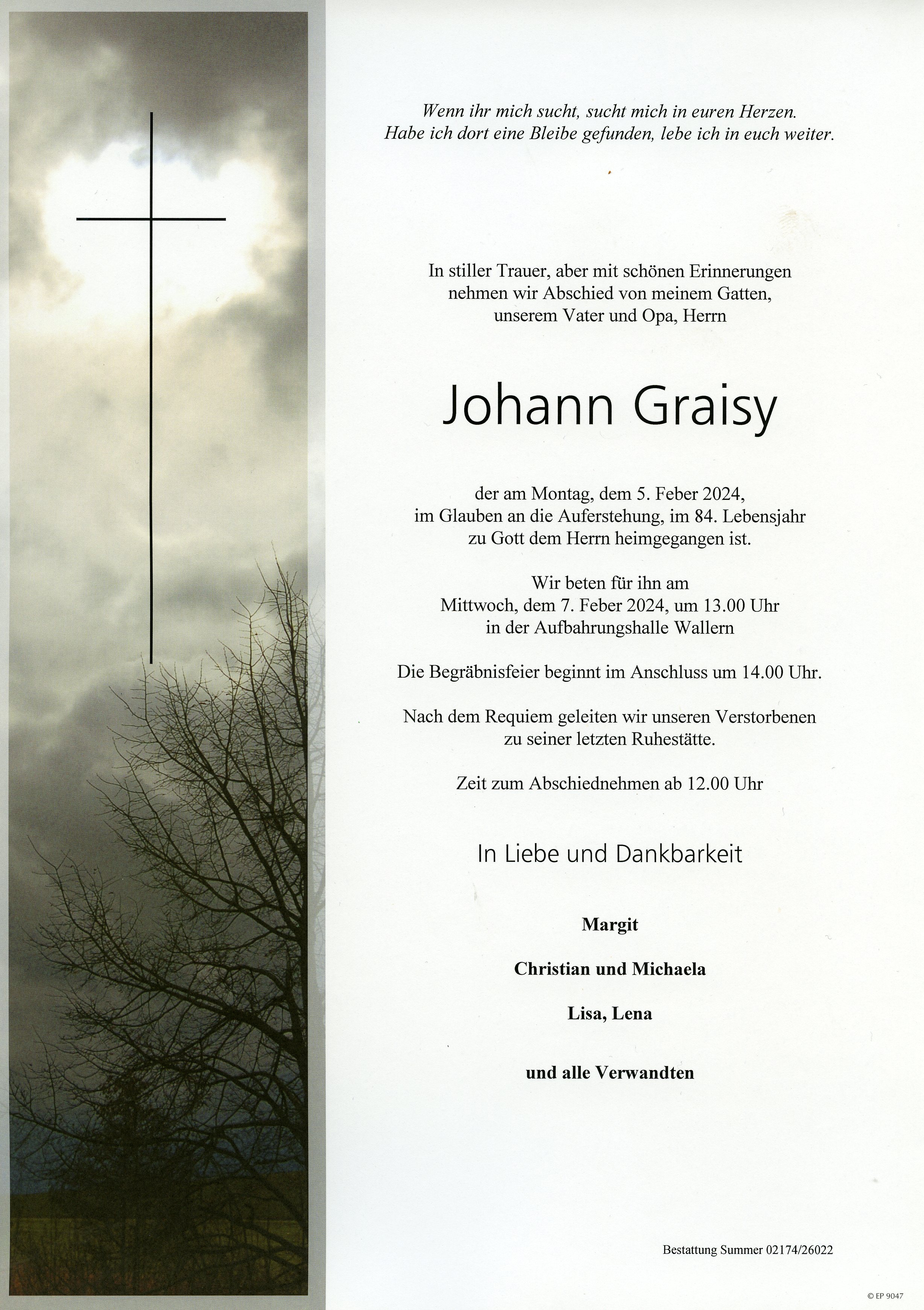 Graisy Johann aus 1020 Wien, gestorben am 5. Feber 2024