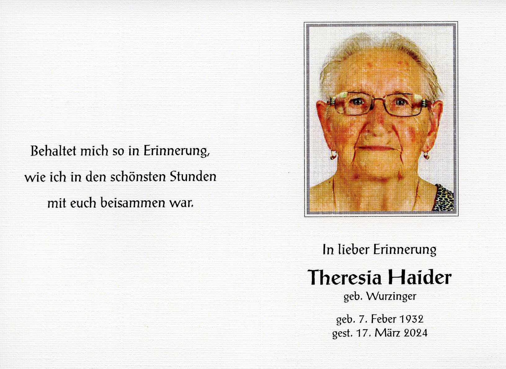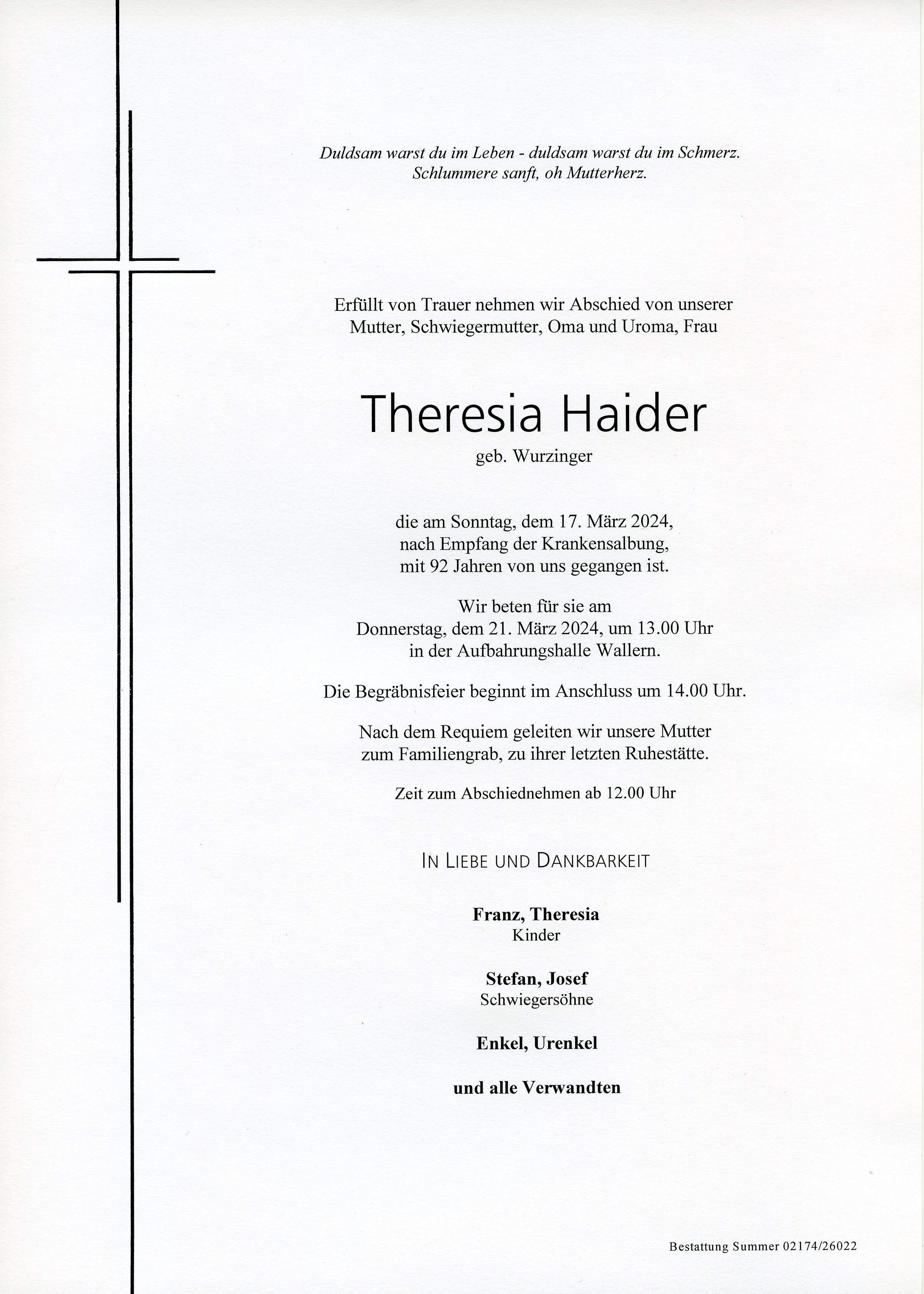 Haider Theresia aus 7151 Wallern, gestorben am 17. März 2024