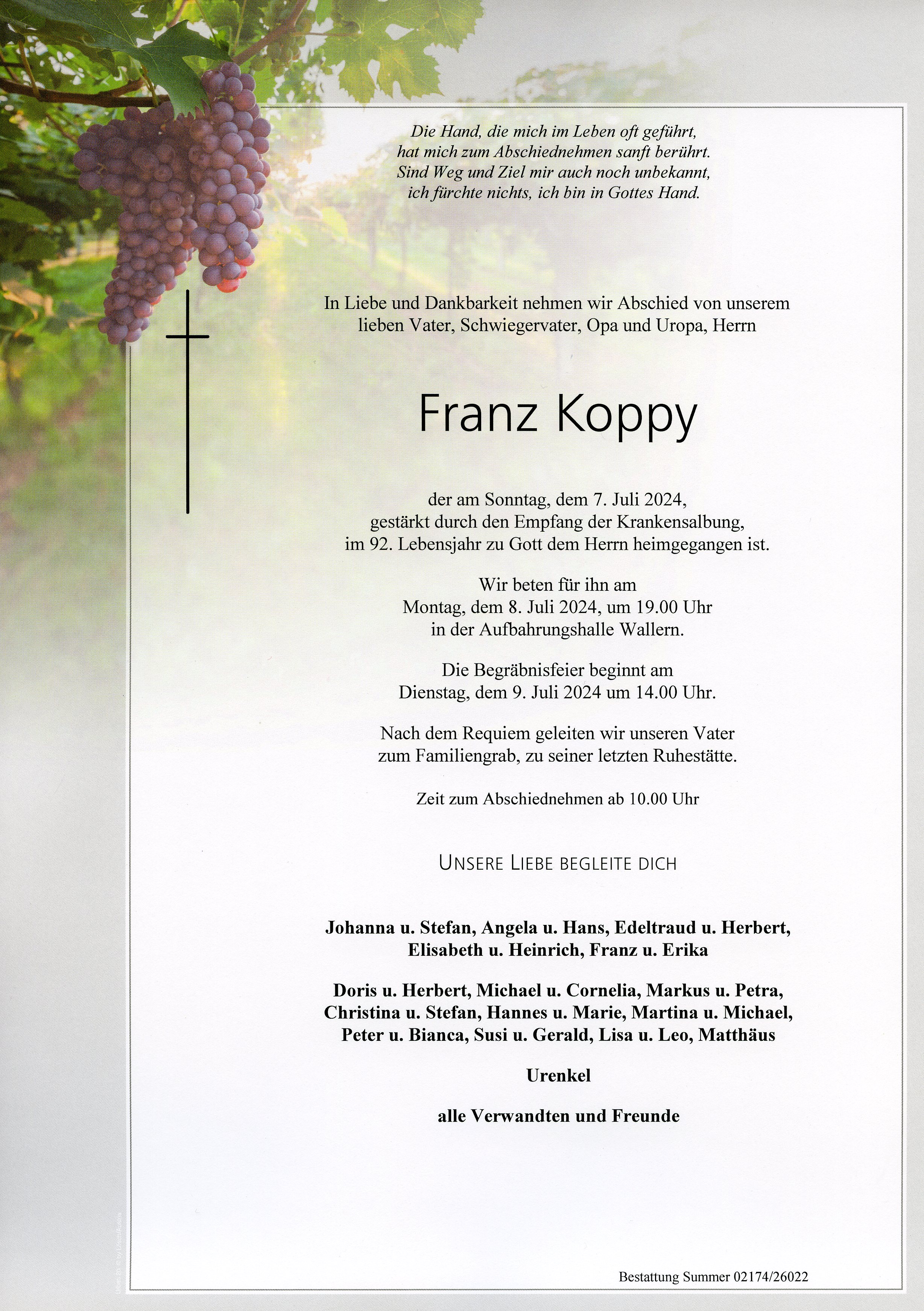 Koppy Franz aus 7151 Wallern, gestorben am 7. Juli 2024