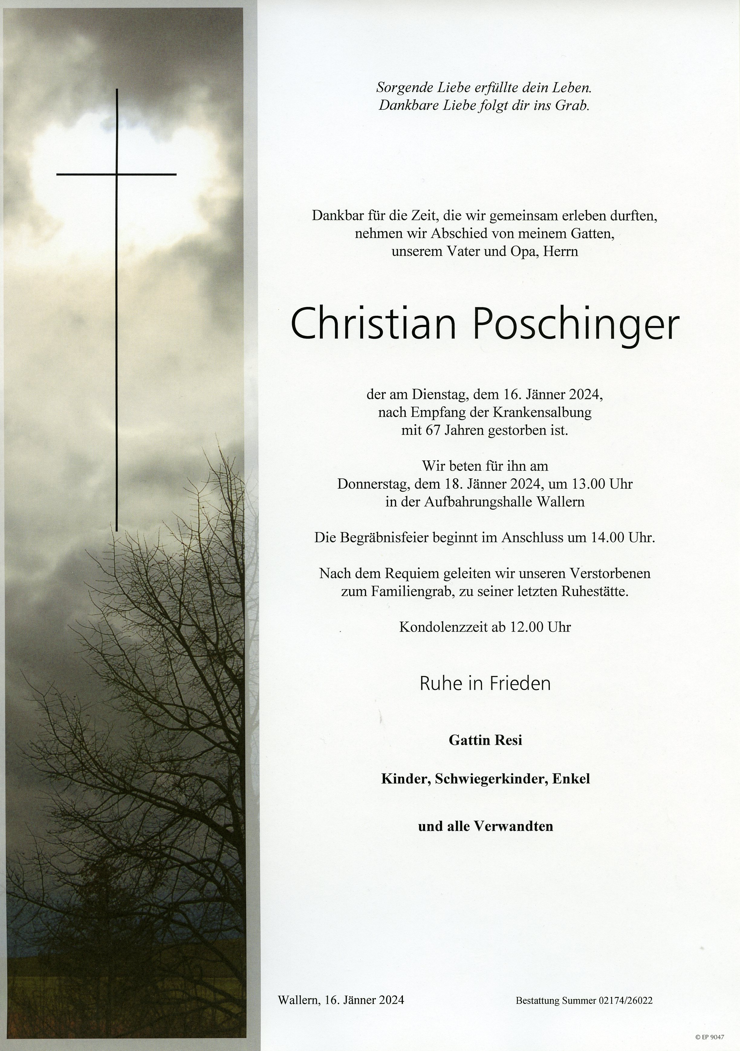 Poschinger Christian aus 7151 Wallern, gestorben am 16. Jänner 2024
