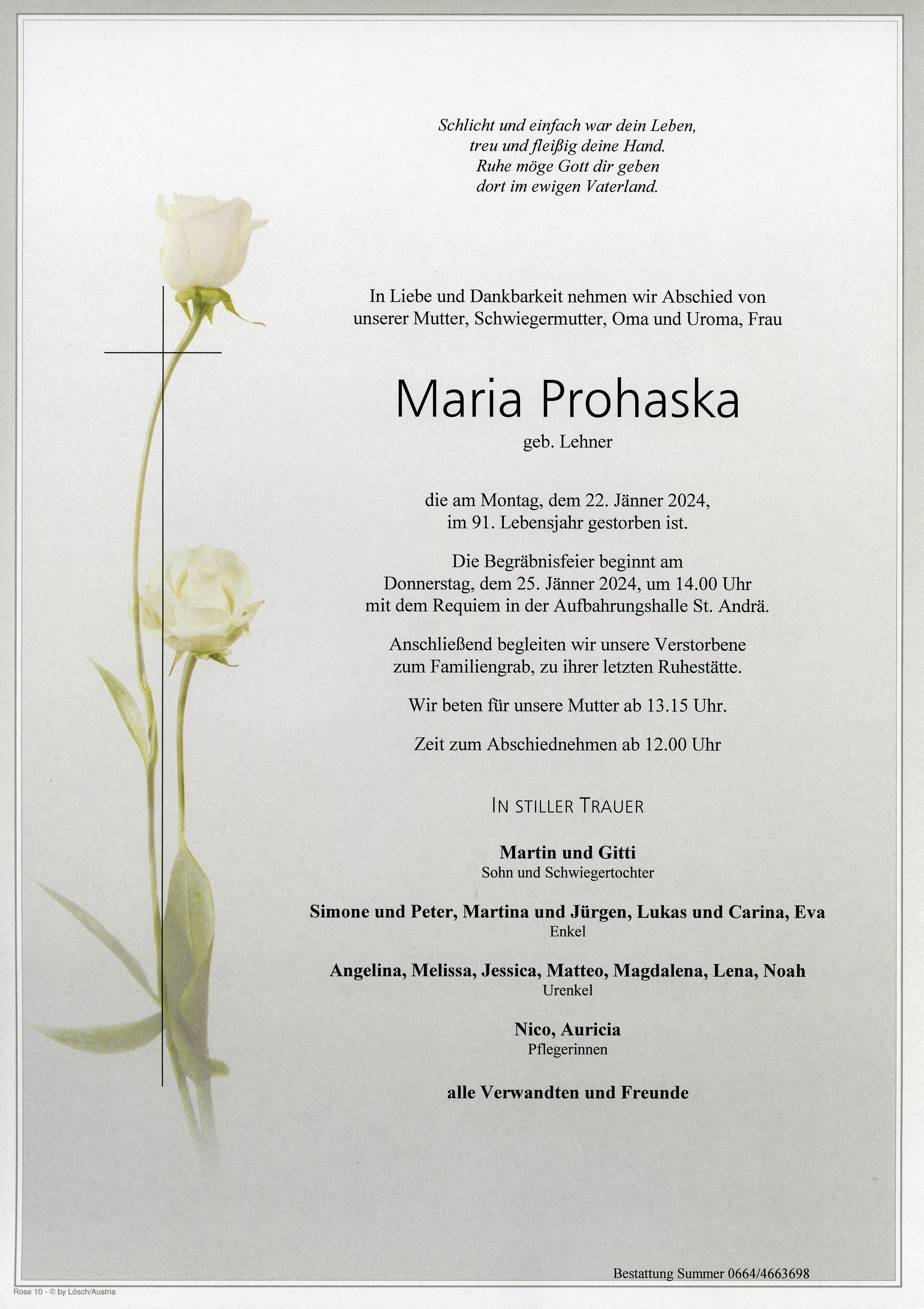 Prohaska Maria aus 7161 St. Andrä am Zicksee, gestorben am 22. Jänner 2024