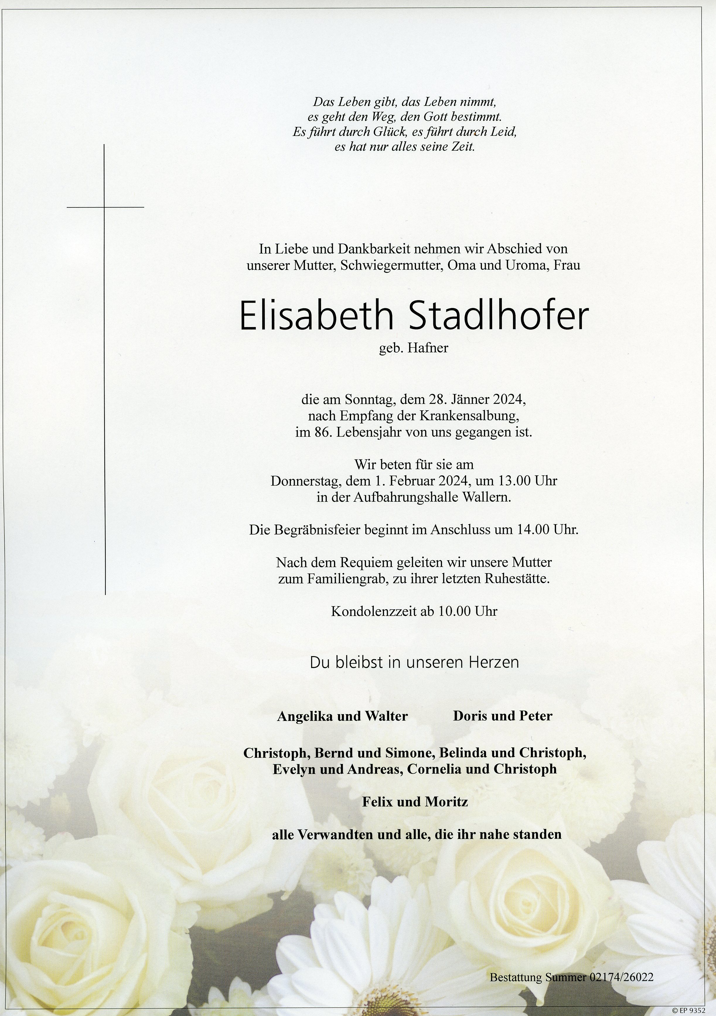 Stadlhofer Elisabeth aus 7151 Wallern, gestorben am 28. Jänner 2024