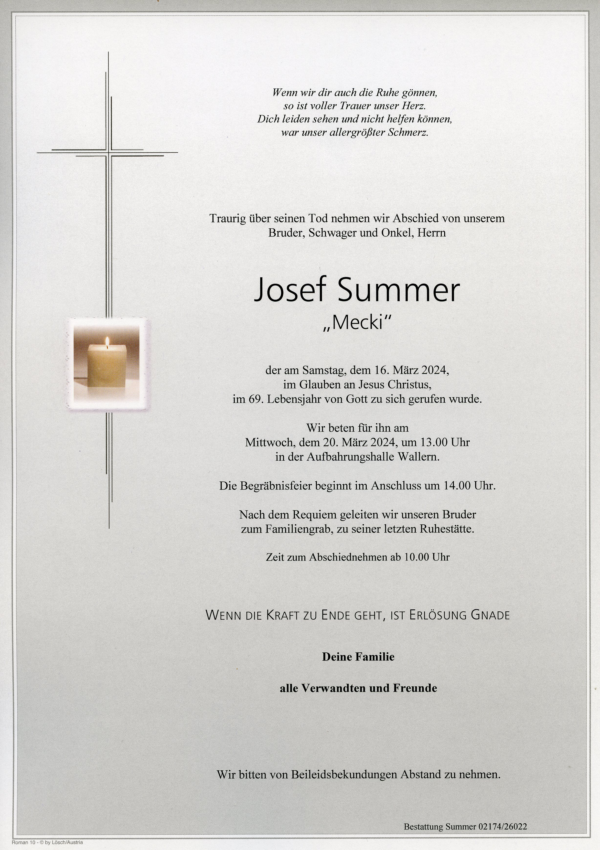 Summer Josef aus 7151 Wallern, gestorben am 16. März 2024