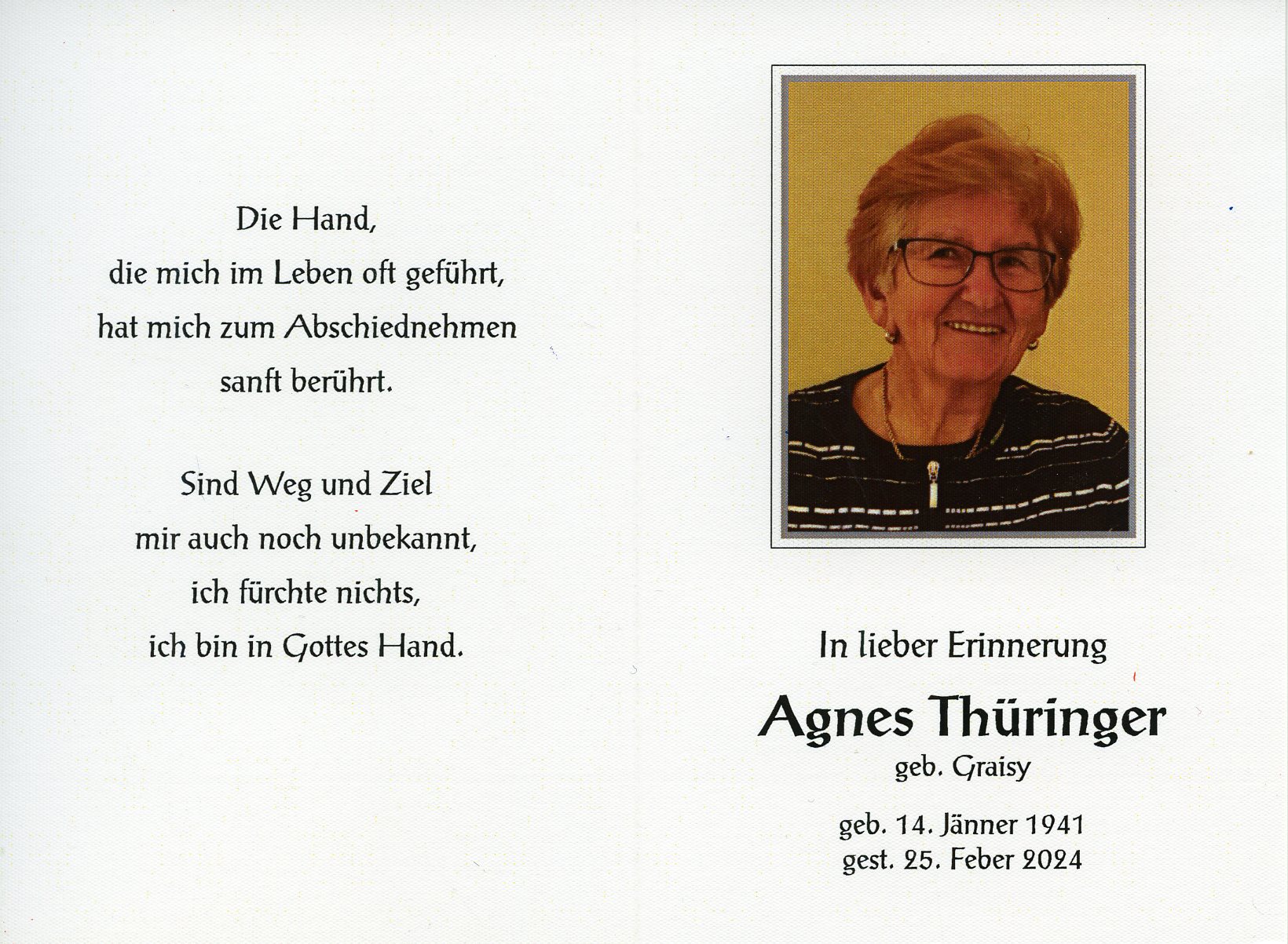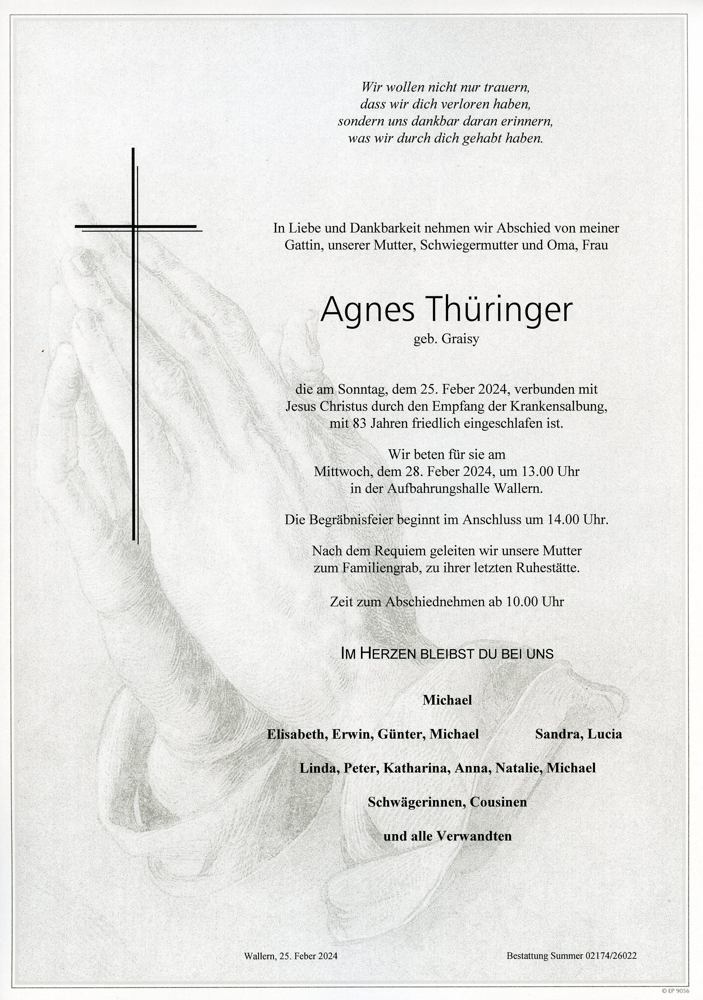 Thüringer Agnes aus 7151 Wallern im Burgenland, gestorben am 25. Feber 2024