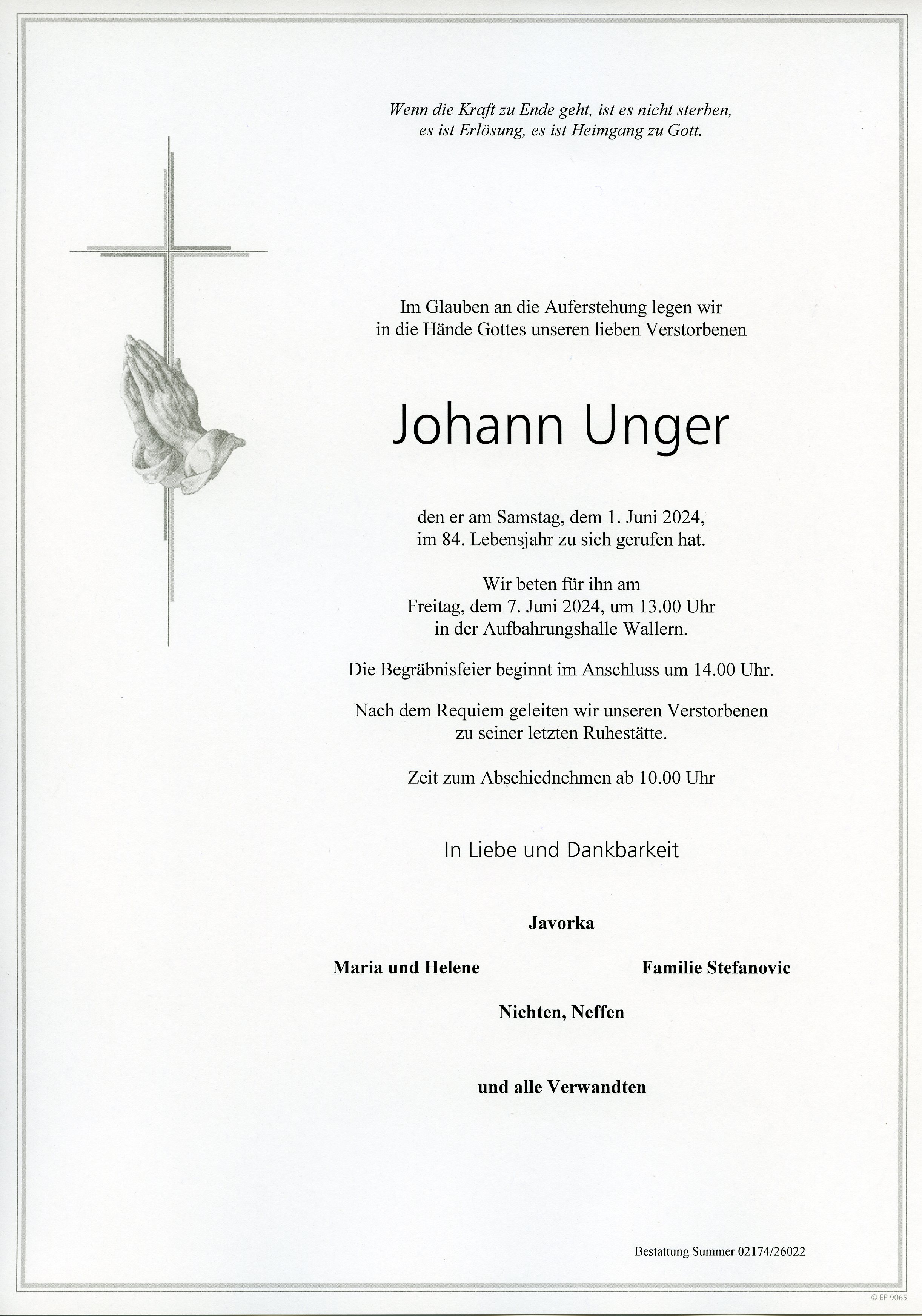 Unger Johann aus Wien, gestorben am 1. Juni 2024